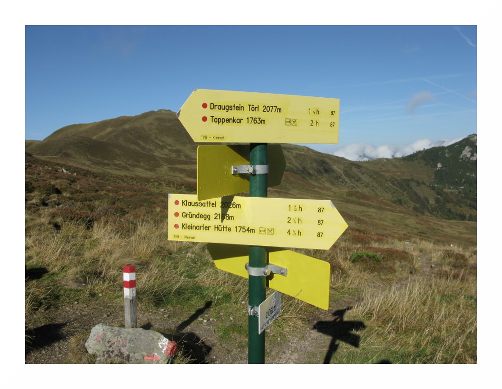 Zum Törl sind es angeblich 75 min, zu schaffen ist es jedoch in 45 min, die Zeit zum Gründegg stimmt dagegen exakt, die zur Kleinarler Hütte habe ich dagegen um gut eine Stunde unterboten. Insgesamt sind sämtliche Gehzeiten in der Region mit Vorsicht zu genießen. Manche stimmen gut, viele sind übertrieben, manche untertrieben. Hängt eben davon ab, ob man abseits der Touristenpfade wandert (realistischere Zeiten) oder auf ihnen (eher großzügige Zeiten) - und sollte bei der Tourenplanung berücksichtigt werden.