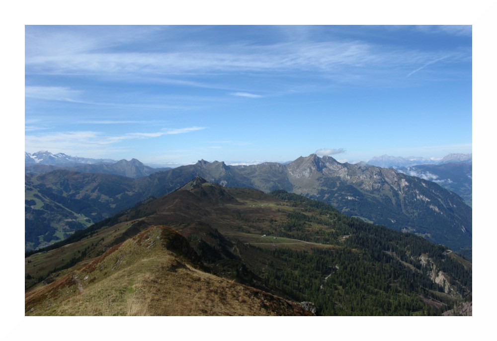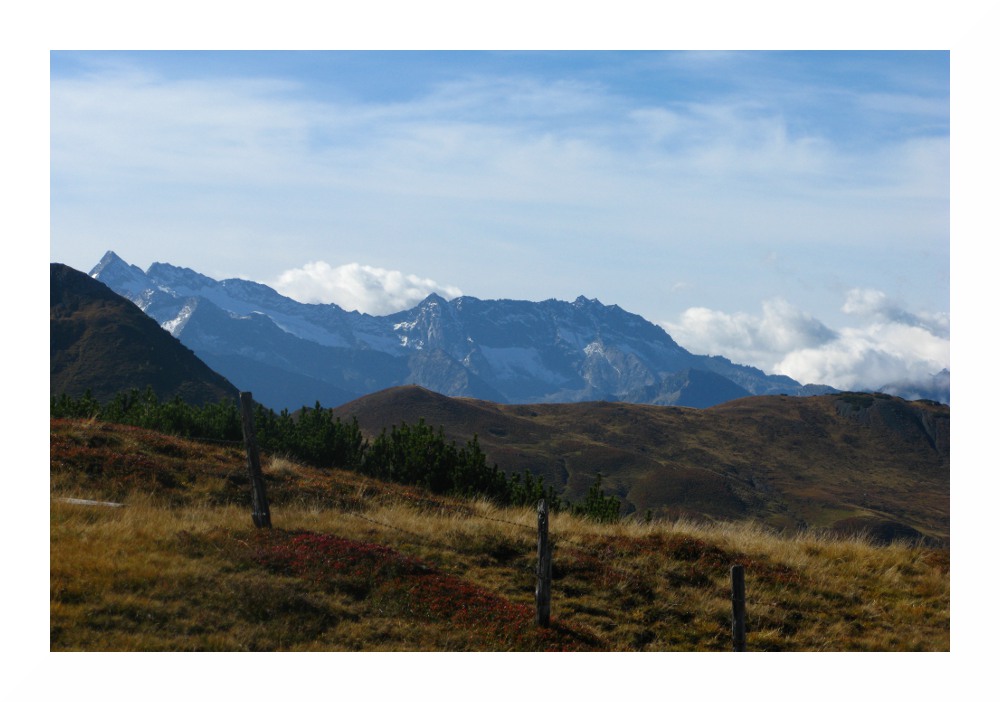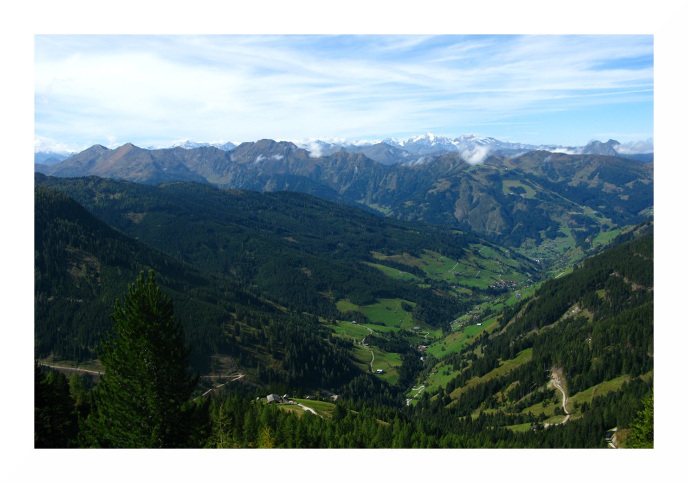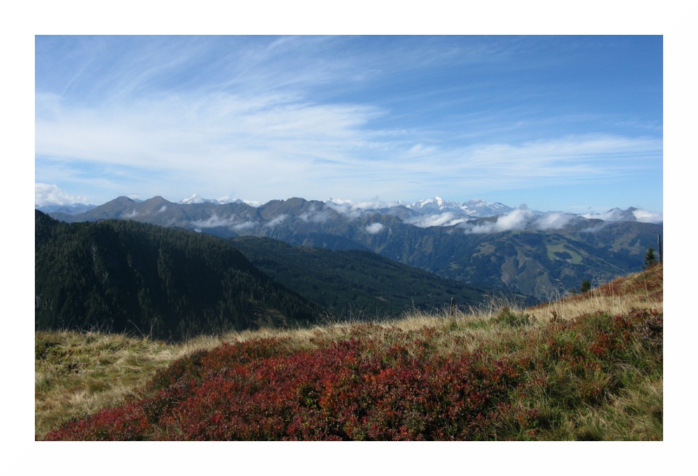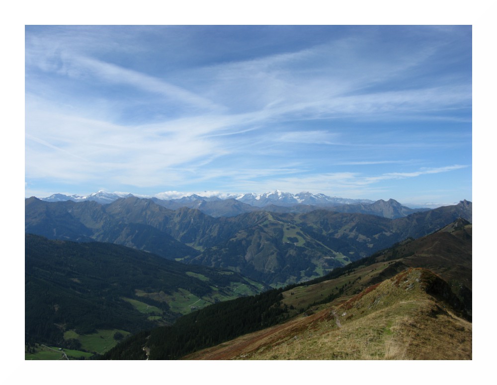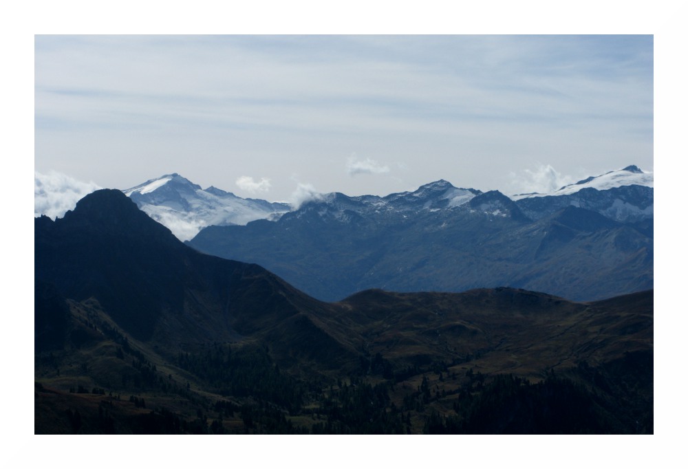 Im Hintergrund v.l.n.r. (die markanten Spitzen): Hocharn (3254m, 30 km) Großglockner (3798m, 48 km) und Großes Wiesbachhorn (3564m, 42 km)