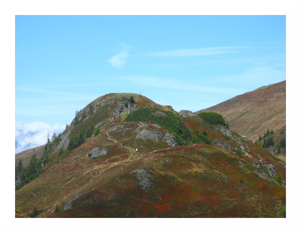 Obwohl spätestens jetzt eindeutig ist, dass ich den letzten Bus auf jeden Fall erwische, beschleunige ich das Tempo, um den früheren Bus (um 15.11) zu nehmen. Irgendwie war mit dem Gipfel für mich der Abschluss von vier schönen Tagen vollbracht, und ich hatte die lange Fahrt zurück nach Wien vor mir, die ich nicht spät am Abend vollziehen wollte. Zusätzlich hatte ich mit Freunden am nächsten Tag eine Wanderung von Wien aus vor, was sich nur ausgehen würde, wenn ich nicht zu spät zurückkomme. Ich habe mir also selbst etwas Druck gemacht, war aber andererseits so bewegungsfreudig, dass mir das flotte Tempo nichts ausmachte, ja sogar Spaß machte.