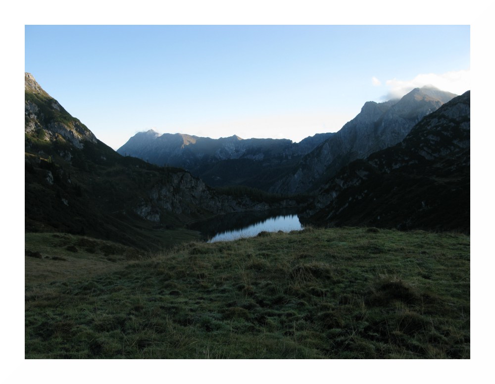 Bild 2: Der letzte Blick hinab zum See, links der Kraxenkogel, rechts Stierkarkopf