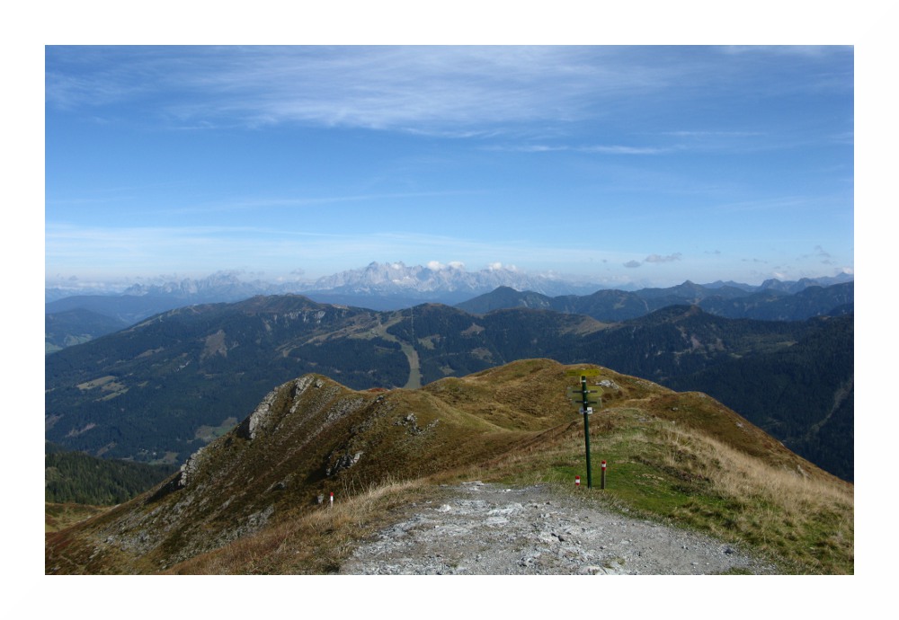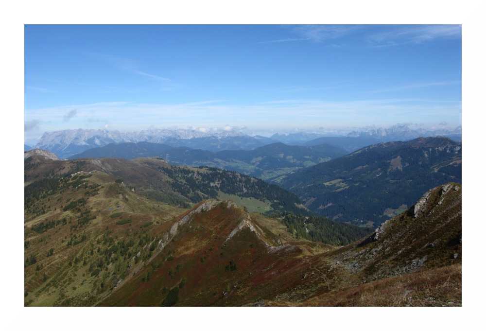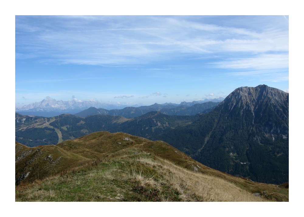 Bild 25: Links der Ennskraxn schaut der Strimskogel (2139m) hervor, links davon Teile des Toten Gebirges (ca. 80 km), weiter links ein Teil des Dachsteins