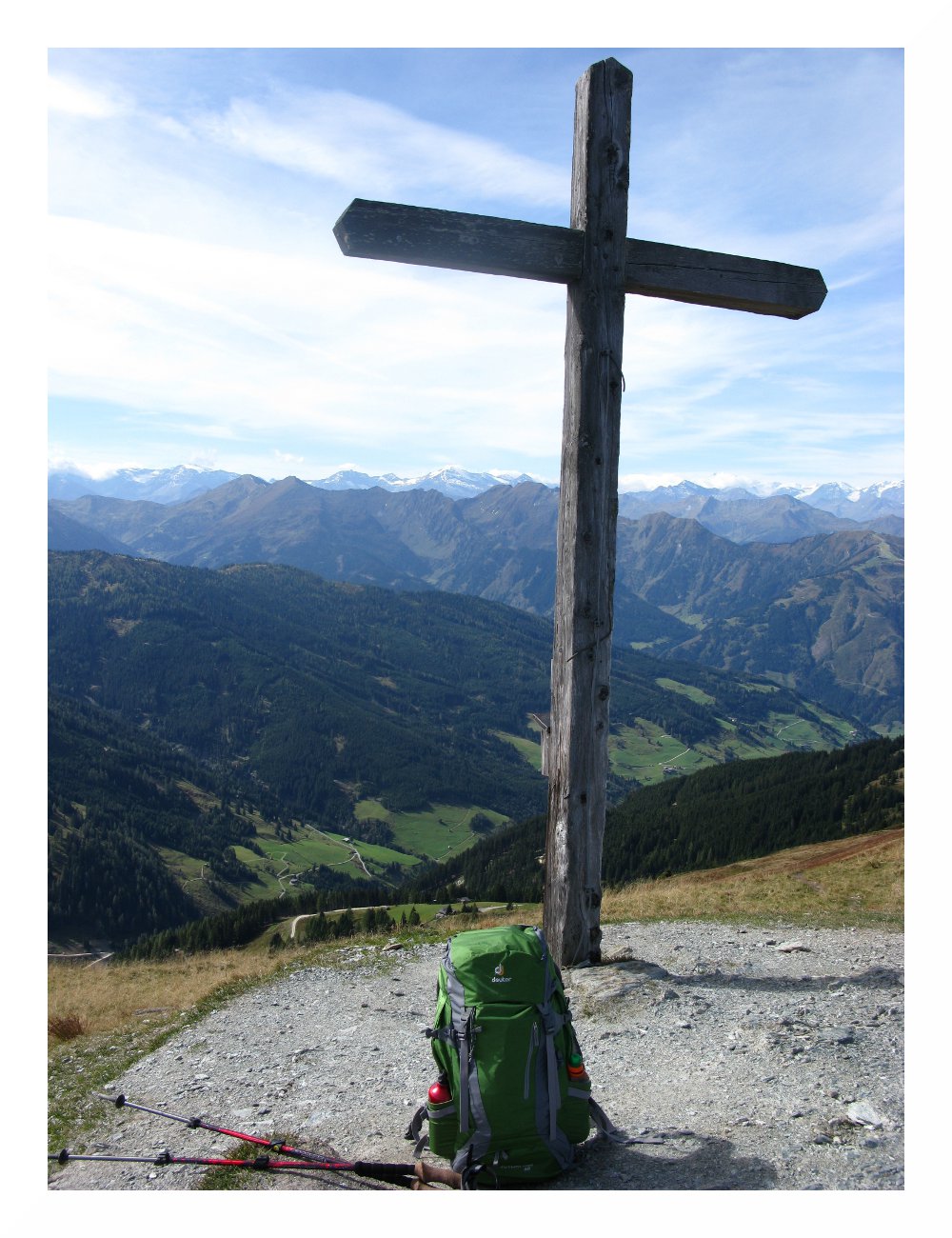Am Roßfeldeck vorbei sehe ich das Gipfelkreuz vor mir, links vorne Höllwand und Sandkogel, dahinter Birnhorn (2634m, 49 km) in den Leoganger Steinbergen,