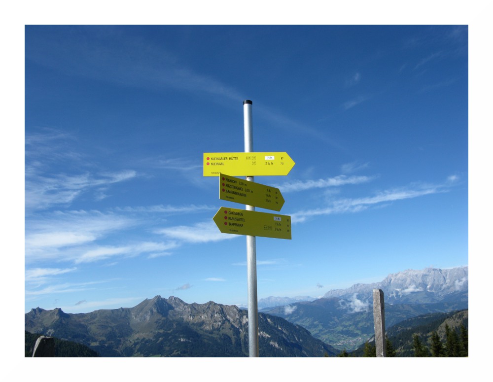 Zur Kleinarler Hütte sind 30 min angeschrieben, was exakt passte, der Abstieg nach Kleinarl dauerte allerdings nur 1 h 45 min, also etwa 45 min weniger.