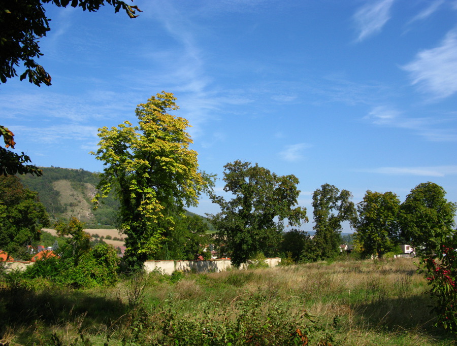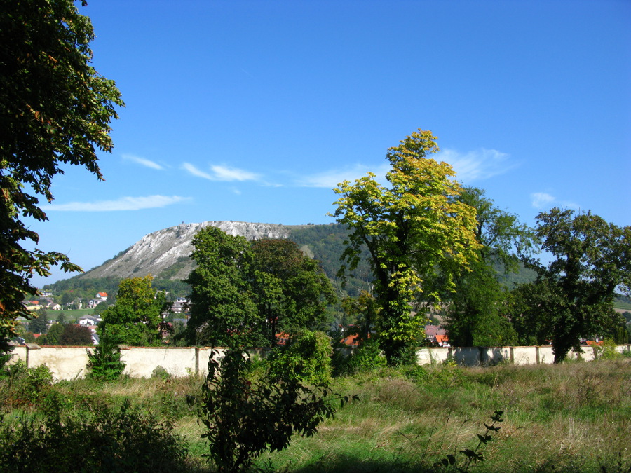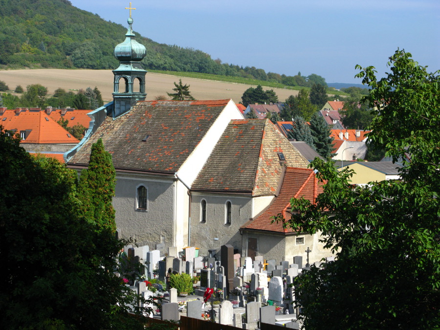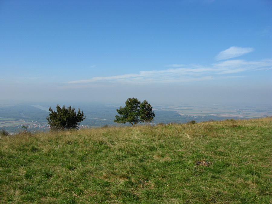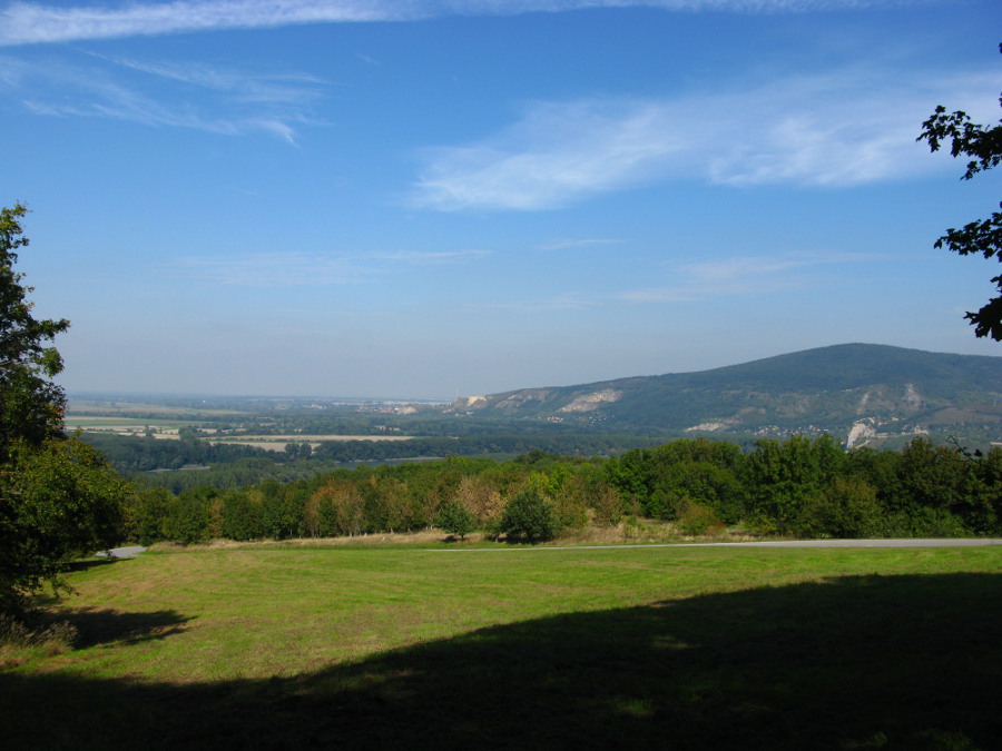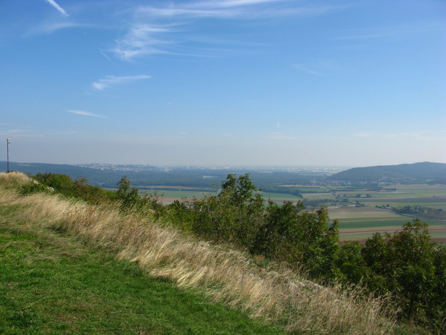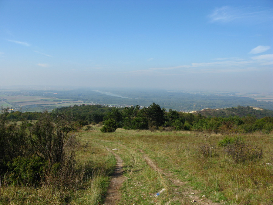 Rechts lugen Teile des Sandbergs hervor, eine geologische Besonderheit in diesem Teil der sonst aus Kalk bestehenden Kleinen Karpaten als Relikt aus dem Tertiär mit 15 Mio. Jahren alten Gesteinsschichten, die Fossilienreste von über 300 Tierarten enthalten.