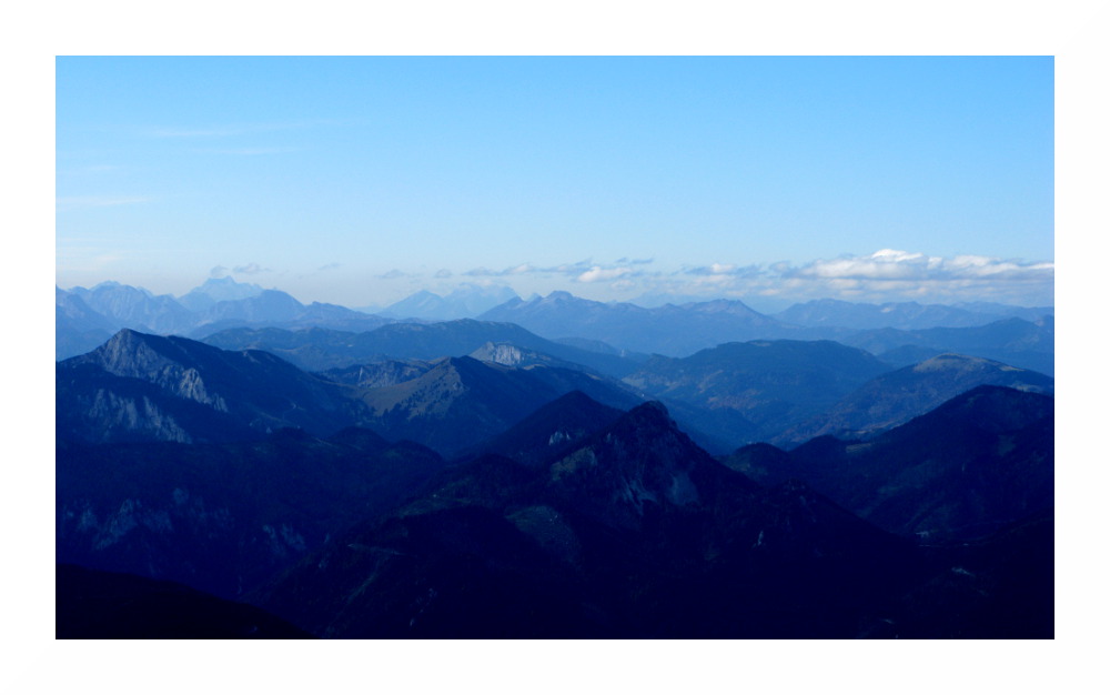 Bild 17: Am Horizont zeigt sich links des Waxeneggs der Hochstadl (1919m, 55 km), rechts Teile der Haller Mauern (ca. 99 km), ganz rechts Dürrenstein (1878m, 55 km) - Warscheneck und Großer Priel gehen leider im Dunst unter.
