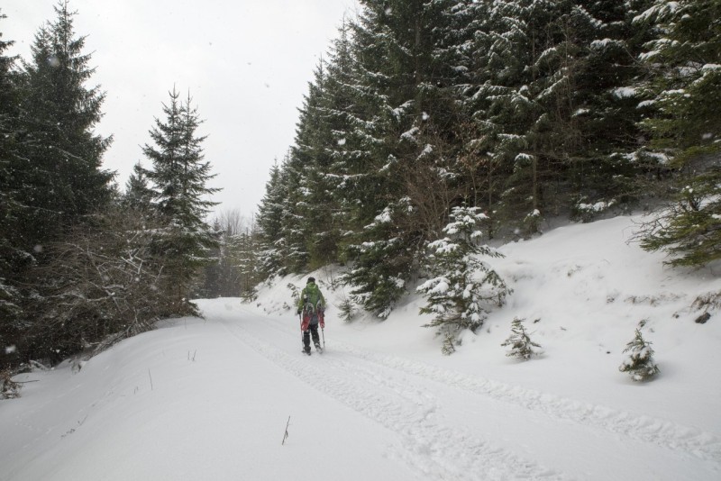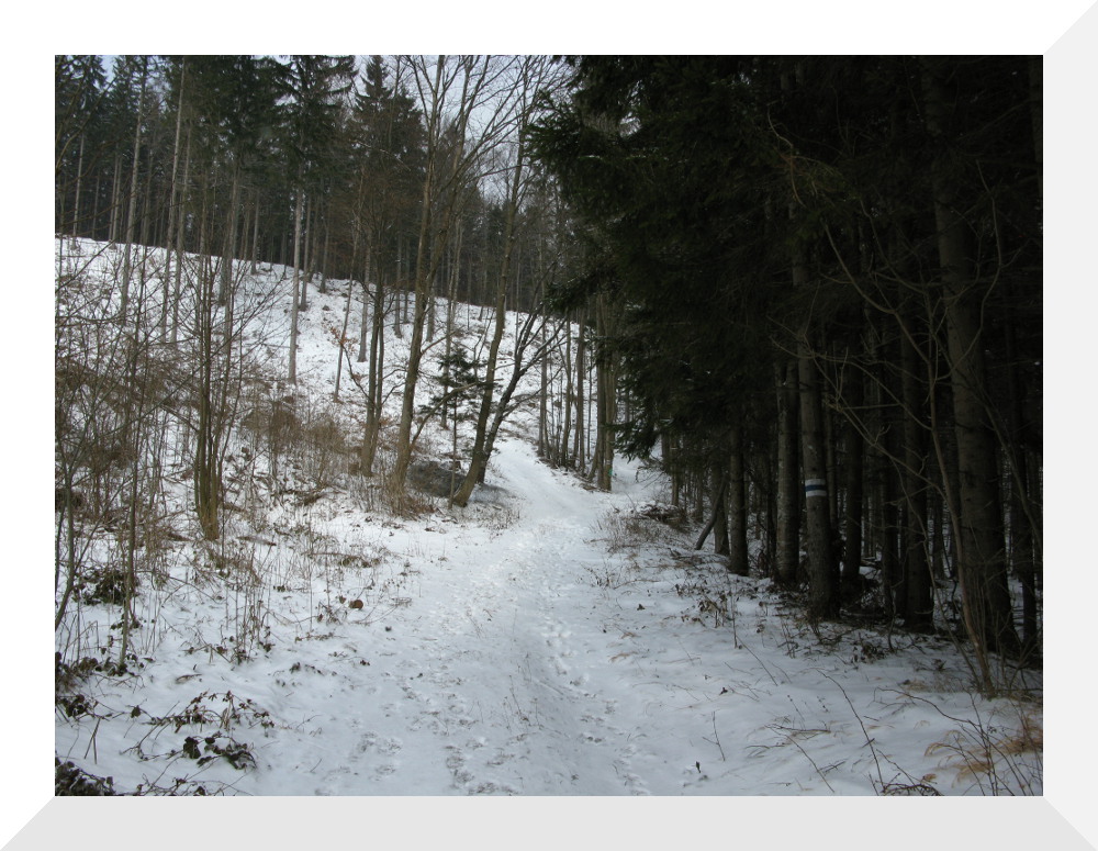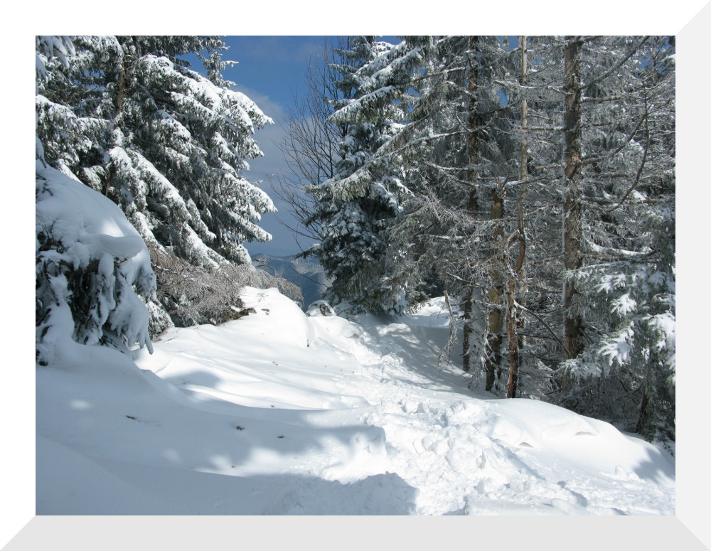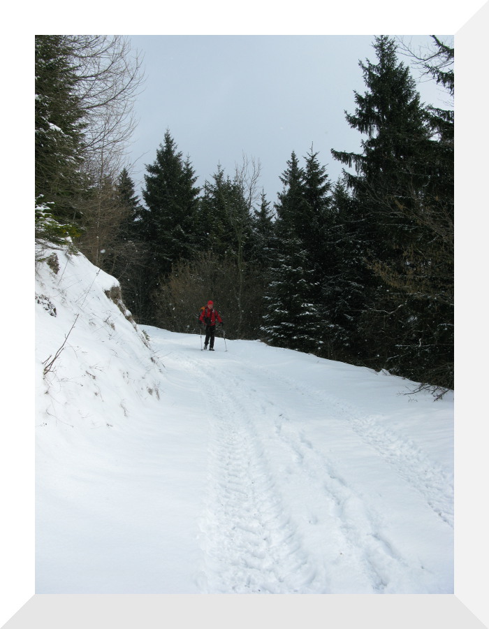 Zunächst geht es mäßig steil aufwärts, schon bald wird der Schnee deutlich mehr (ca. 20 cm), aber wir steigen ja bald wieder ab, also lassen wir sie noch am Rucksack. Nach einer Wegkreuzung, an der wir am Nachmittag vom Retourweg kommen werden, geht es leicht am Südhang des Haltbergs (1114m) bergab