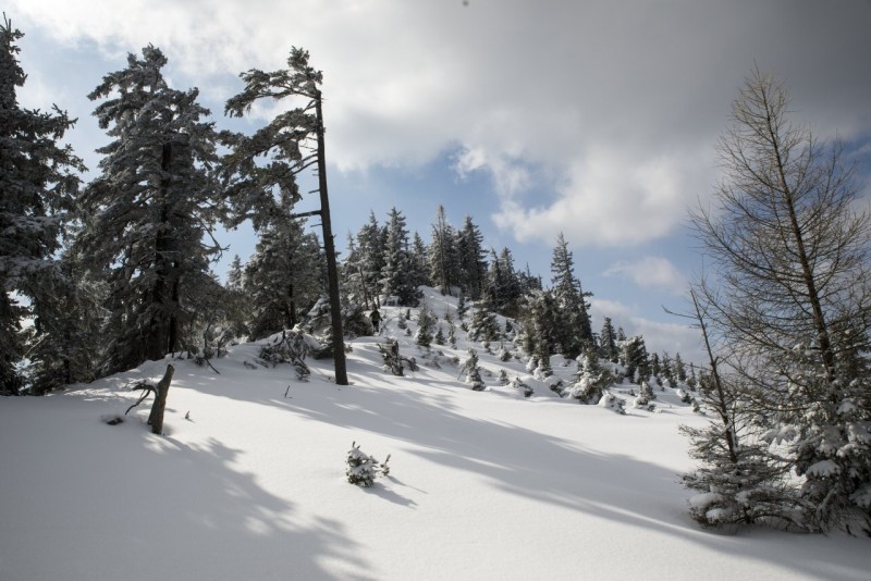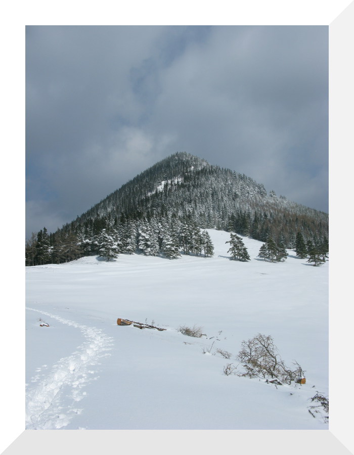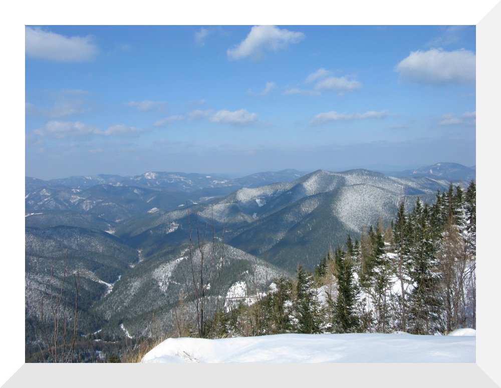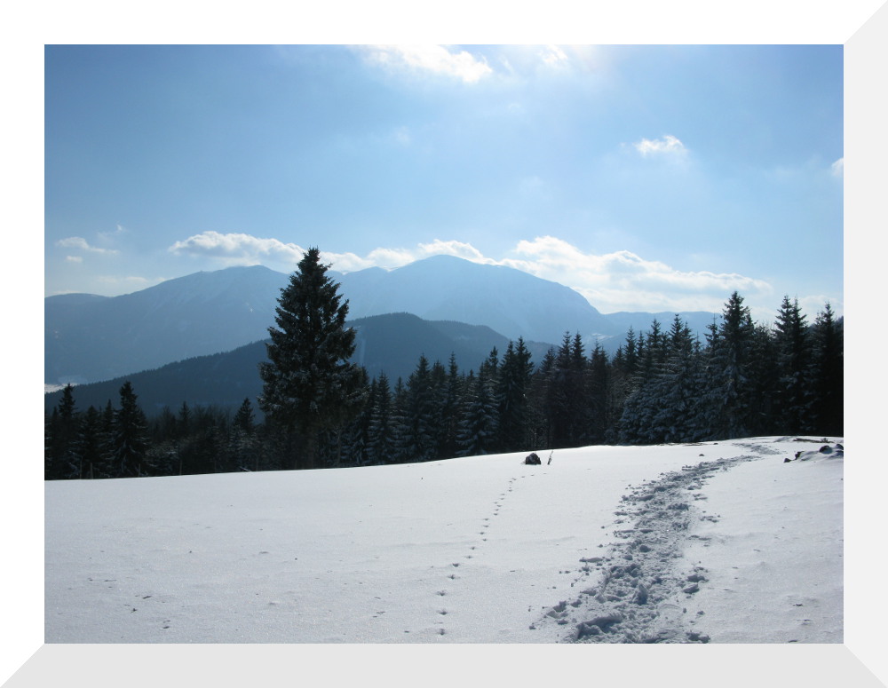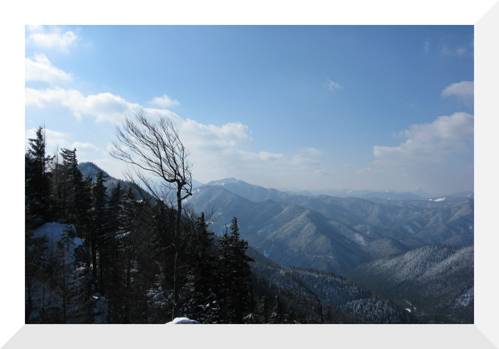 Die Semmering-Wechsel-Region kommt zum Vorschein, rechts der Große Hengst (1450m), der von Csaba Szepfalusi als "Leichte Schneeschuhwanderung" angegeben ist.