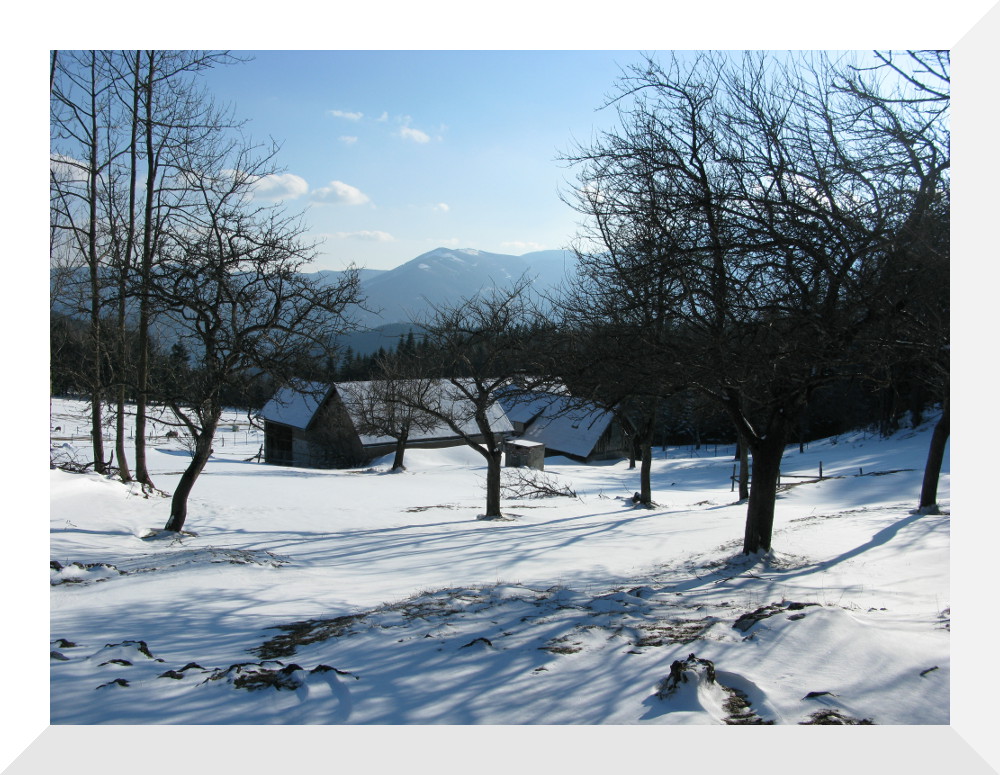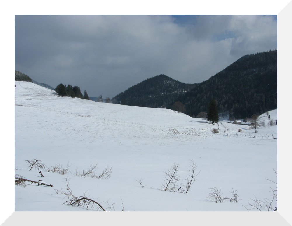 Links die Schoberalm (929m), rechts der Schoberhof, dazwischen im Graben schätzungsweise zwei Meter hohe Schneewächten am Bachbett. Im Hintergrund schaut erstmals der Schneeberg mit seiner abweisenden Felsflanke aus den sich lichtenden Schneewolken heraus.