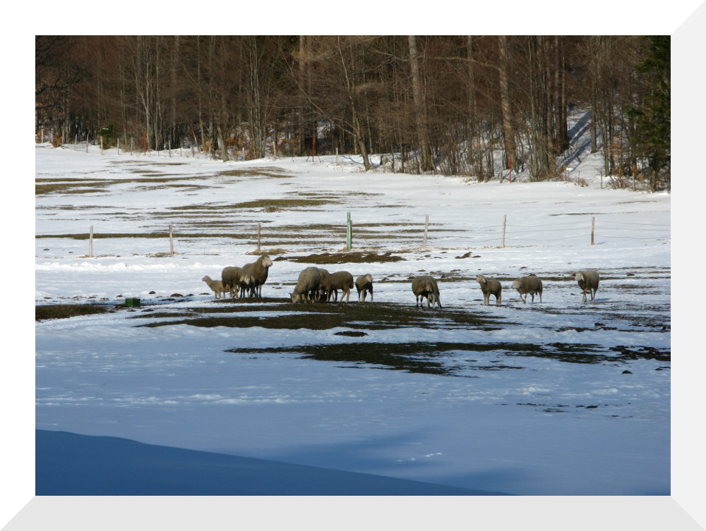Bild 31: Auf den teilweise ausgeaperten Wiesen mit zu Eis gewordenem Neuschnee tummeln sich die ersten Schafe.