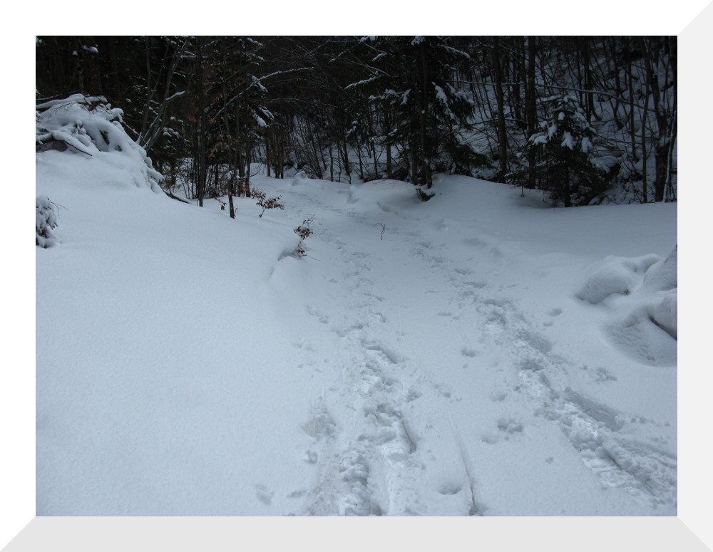 Der Aufstieg bis zum Schoberhof zeigt sich bis auf eine spätere Traktorspur nahezu unverspurt, sodass es durchaus anstrengend aufwärts geht. Immer wieder sieht man Verwehungen, die es bis in diesen engen Graben geschafft haben.