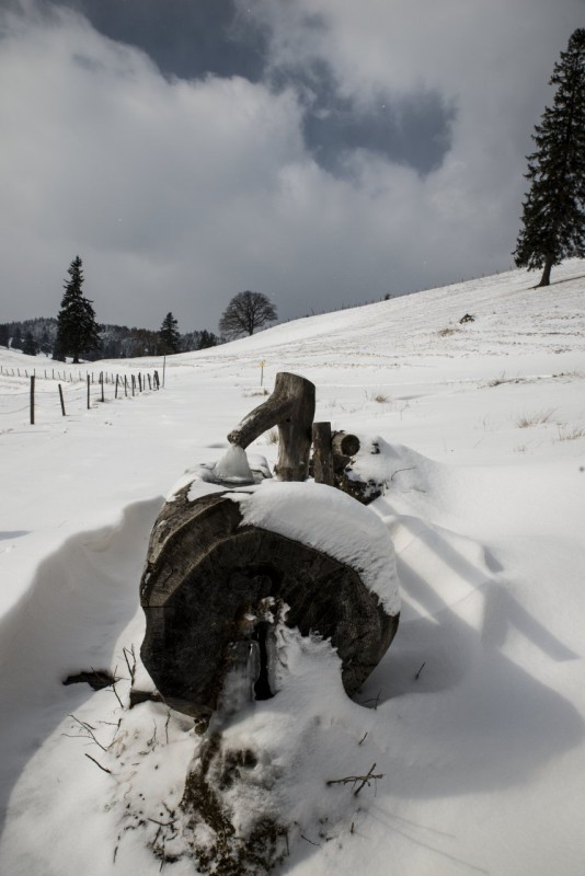 Vorbei geht es an glitzernden Schneewiesen und in einem tief eingewehten Karrenweg hinab. Mit jedem Schritt sammelt sich mehr Schnee auf dem Schuh. Wieder ist viel Spuren angesagt. Dass es dabei leicht bergab geht, ist ein kleiner Trost, aber immerhin.