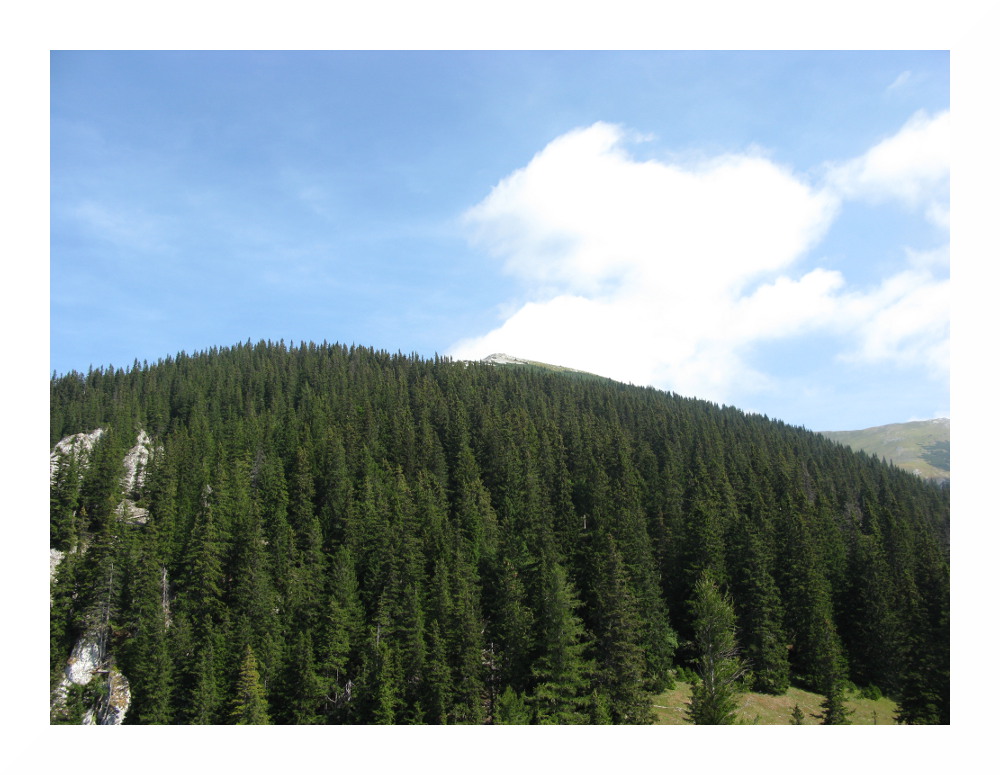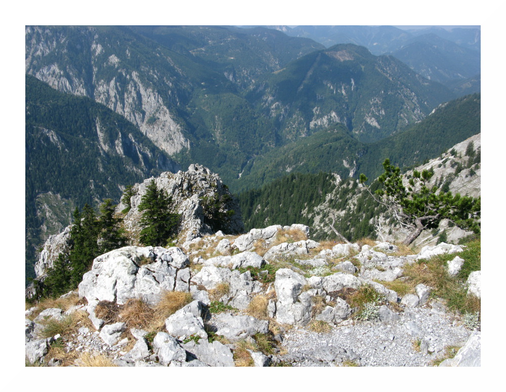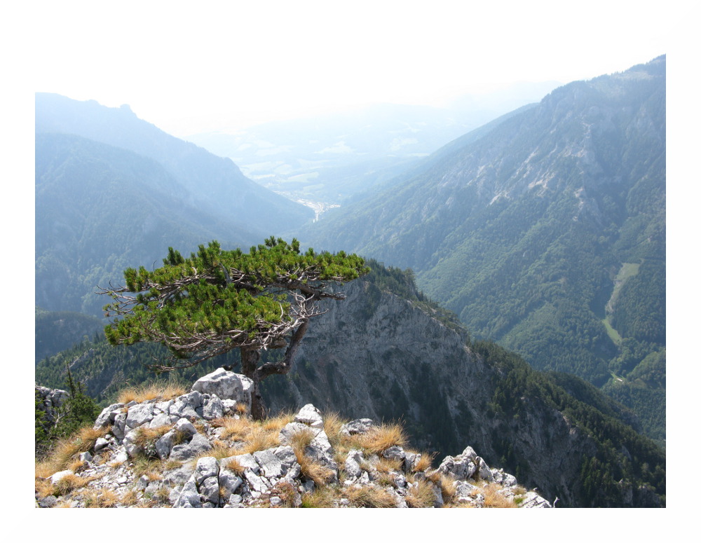 Miserables Fotolicht. Die Föhre verdeckt den Hochgang-Gipfel, im Hintergrund der Ausgang des Höllentals mit dem Mittagstein (1300m, links), rechts hingegen die Brandschneide, die sich immer am Kamm entlang zur Rax hinaufzieht und im oberen Bereich ins felsige und teils seilversicherte Gelände (Camillo-Kronich-Steig) wechselt.