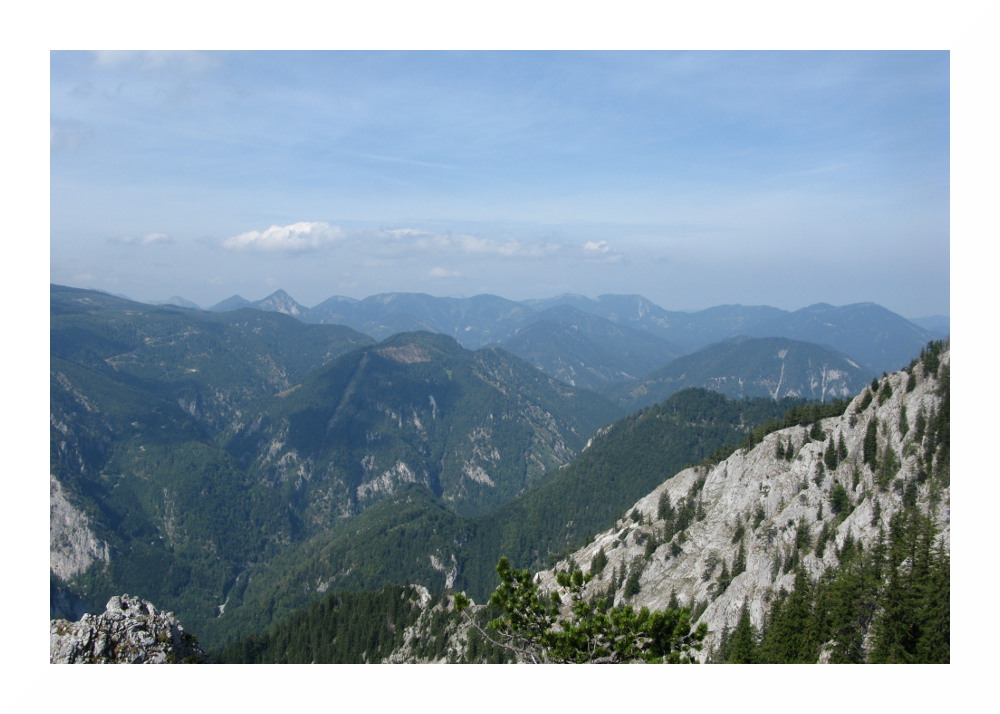 Ganz links über dem Raxplateau spitzt die Donnerwand (1799m) hervor, der erste deutlichere Felsgipfel ist das Hohe Waxenegg (1647m), gleich rechts folgt der Glatzeter Kogel (1594m) und der Große Sonnleitstein (1639m). Weiter rechts sind Göller und Gippelmauer sowie Obersberg noch klar erkennbar.