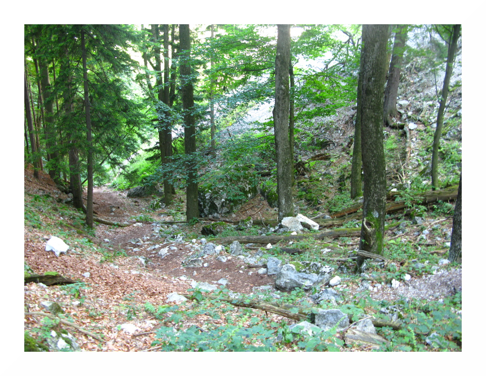 Was hier herumliegt, wird nicht aufgeräumt. Der Steig (ganz rechts) zieht sich dennoch sichtbar den Graben hinauf.