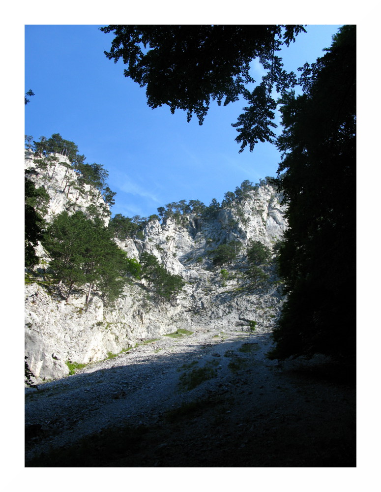 Links das Große Höllental, gleich rechts mit der Forststraße das Kleine Höllental, rechts daneben beginnt der Große Kesselgraben, eine romantische Schlucht, die sich im harmlosen Gehgelände bis zum Klobentörl (1648m) auf der Rax hinaufzieht. Ganz rechts der Hainboden (1248m).