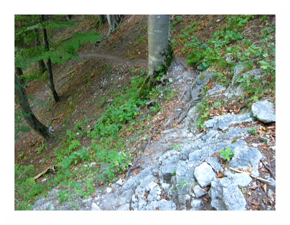 Hier verengt sich der Steig wie in den Berichten verschrieben, zudem geht es rechts abschüssig den Wald hinunter. Ich empfand sie jedoch als wesentlich harmloser als geschildert, bei Nässe ist sie aber möglicherweise durch die Wurzeln und das offen liegende Gestein unangenehm zu gehen.