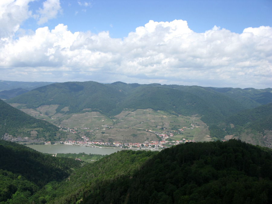 Bild 1: Gegenüber liegt Spitz an der Donau, links die Ruine Hinterhaus. Im Hintergrund der 744m hohe Eichberg.