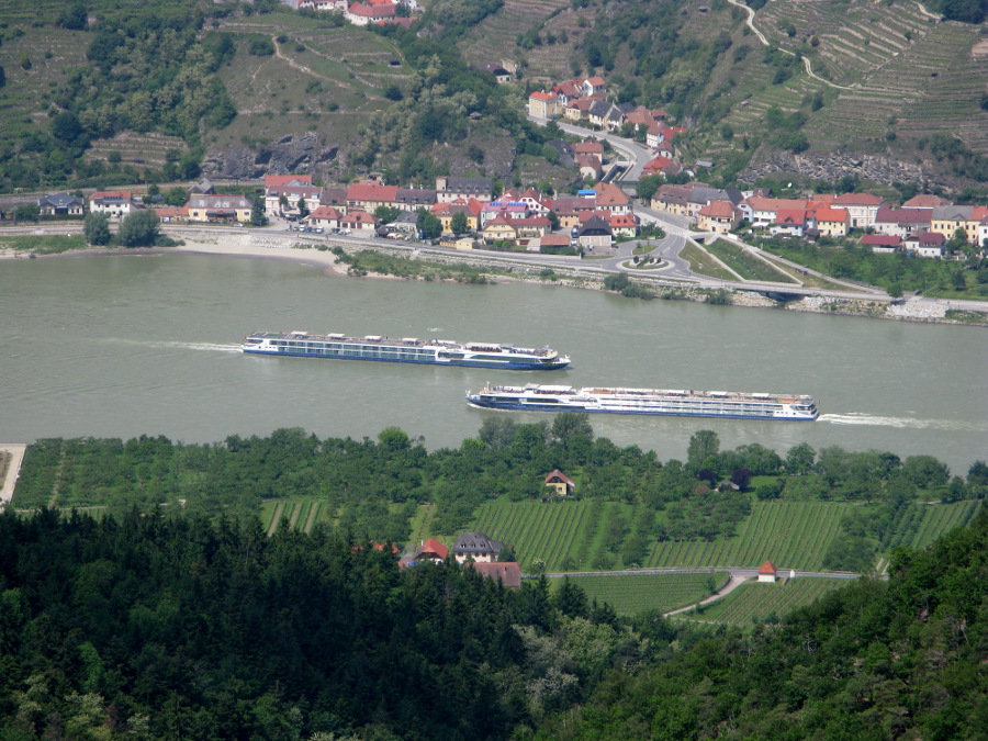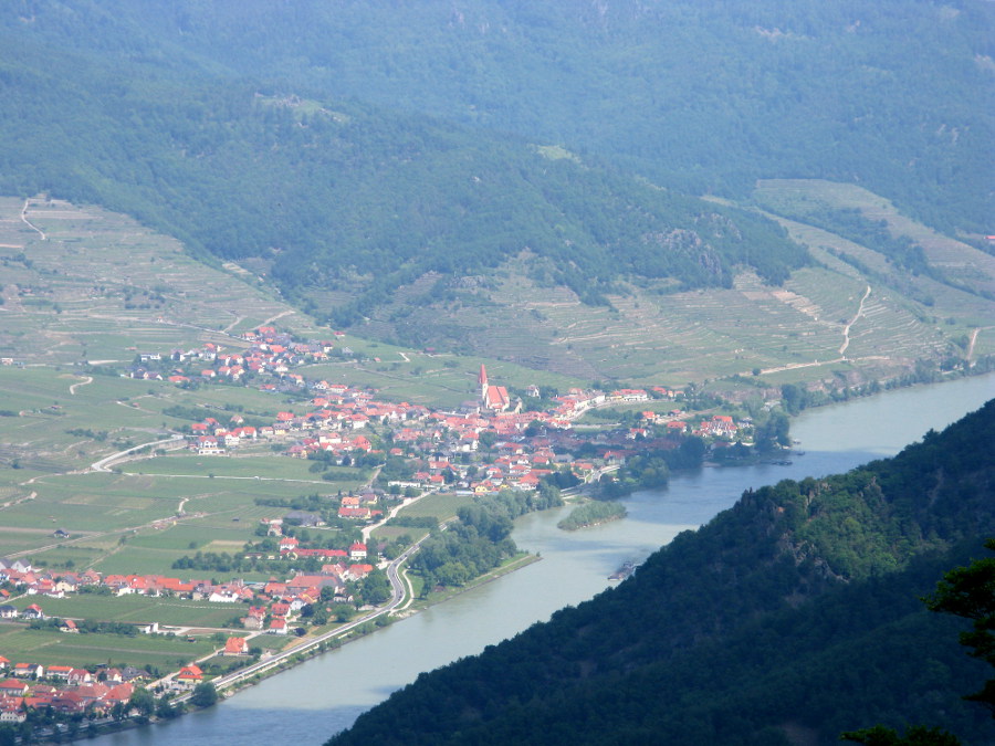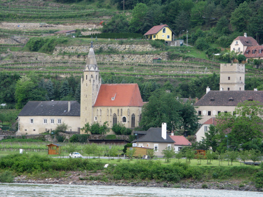 Bild 11: Stromabwärts links Weißenkirchen mit der mächigen gotischen Wehrkirche.