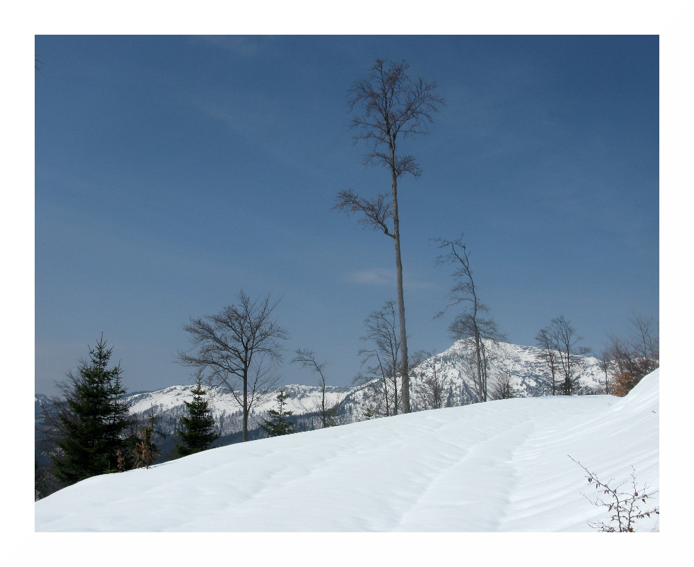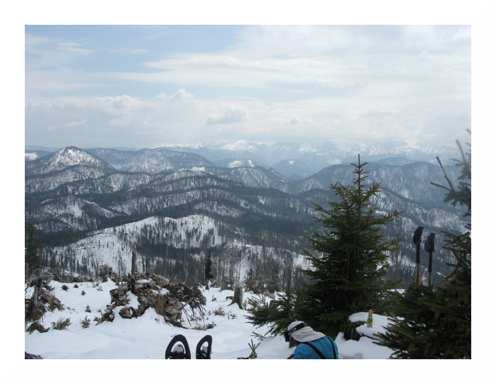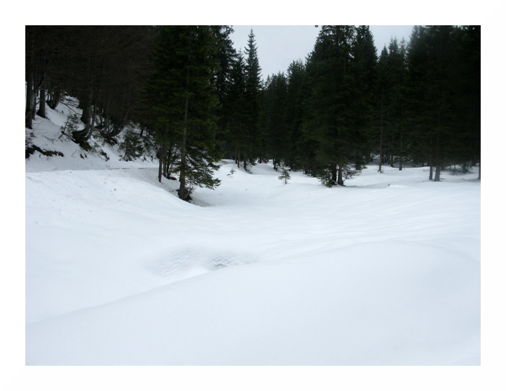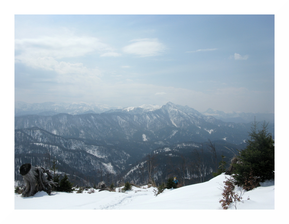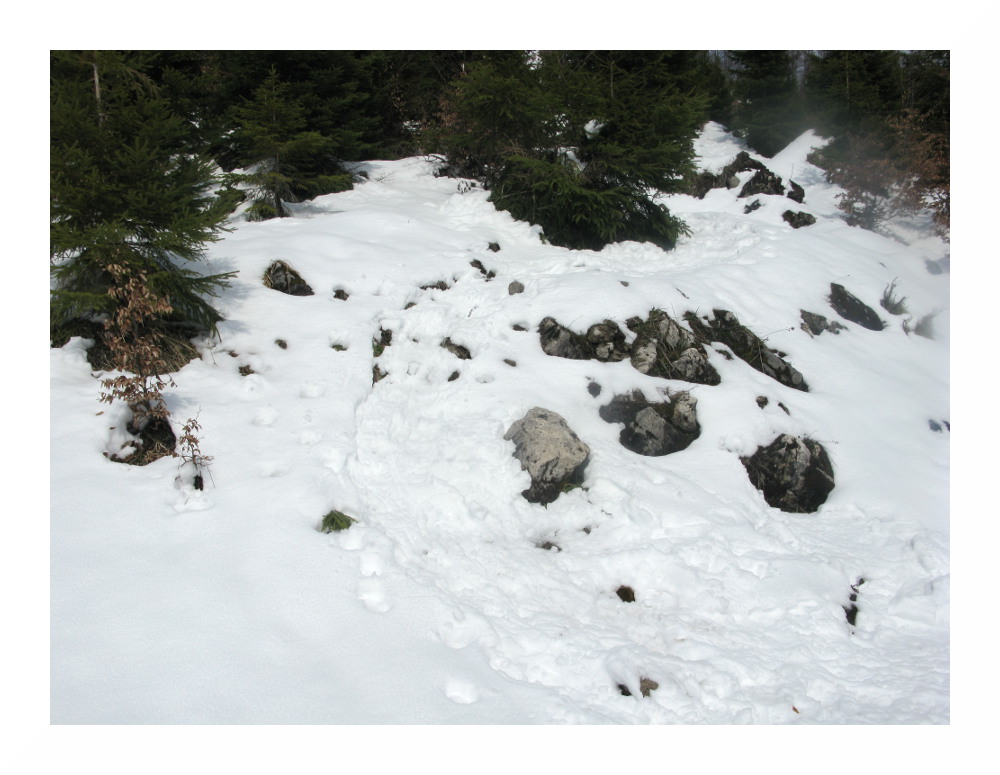 Die zweite Tour begann bei vielen Wolken in der Früh, deren Restfeuchte durch vorübergehend leichten Regen ausgequetscht wurde. Danach lockerten die Wolken rasch auf und am Nachmittag zeigte sich häufiger die Sonne. Der Schnee wurde wieder sehr weich, schwer und anstrengend zu spuren. Es lag jedoch immer noch genug, selbst hier auf knapp 1000 m lagen im Wald 30-50 cm, alles Neuschnee. Und ich sah erneut einen Auerhahn.