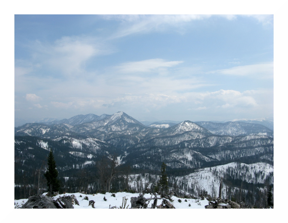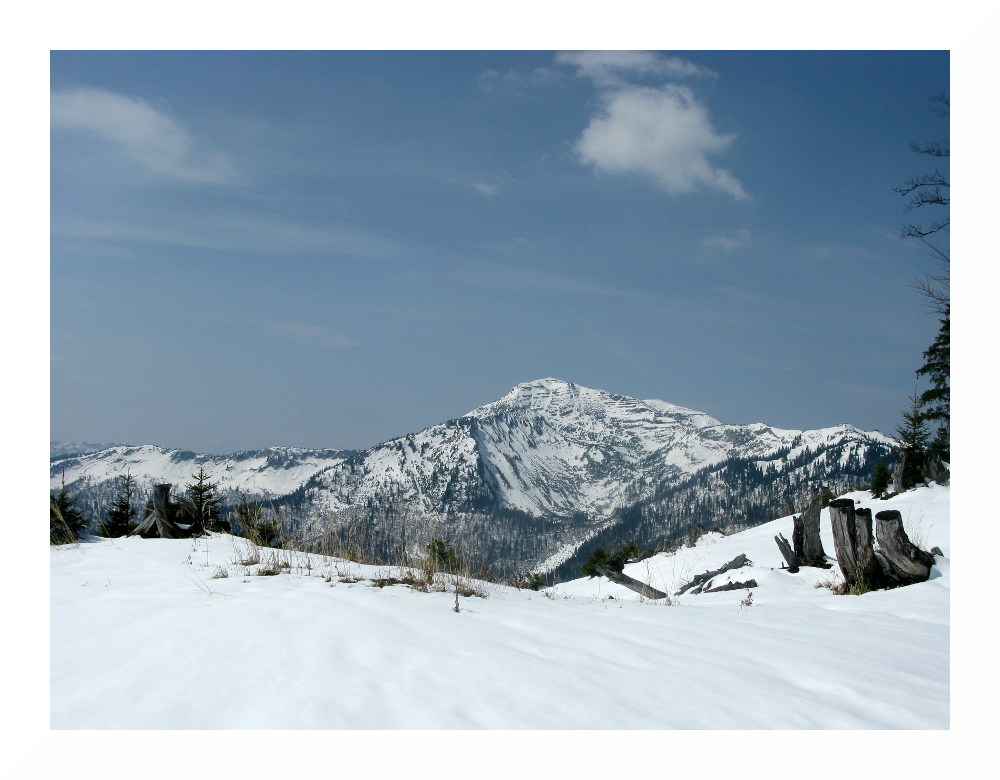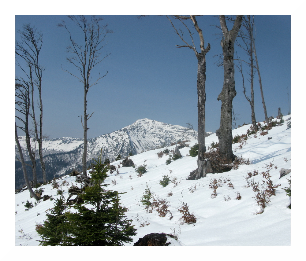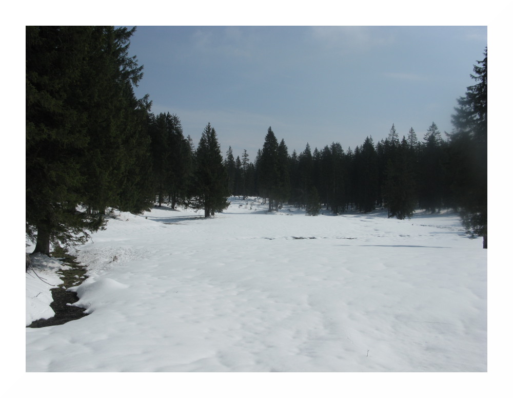 Die zweite Tour begann bei vielen Wolken in der Früh, deren Restfeuchte durch vorübergehend leichten Regen ausgequetscht wurde. Danach lockerten die Wolken rasch auf und am Nachmittag zeigte sich häufiger die Sonne. Der Schnee wurde wieder sehr weich, schwer und anstrengend zu spuren. Es lag jedoch immer noch genug, selbst hier auf knapp 1000 m lagen im Wald 30-50 cm, alles Neuschnee. Und ich sah erneut einen Auerhahn.