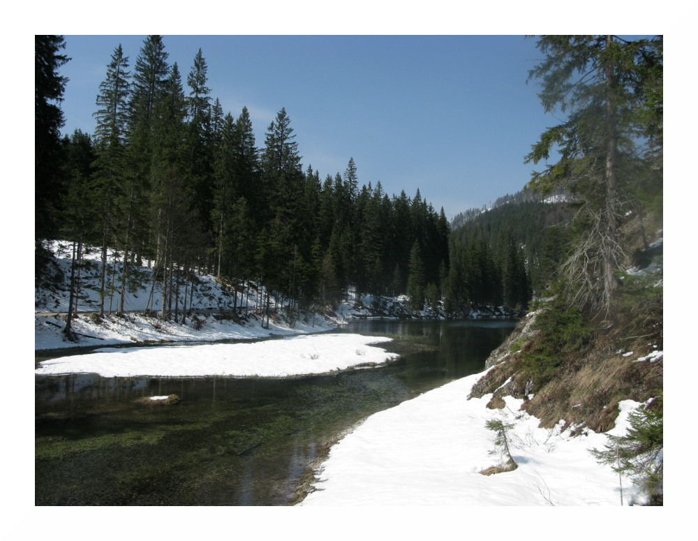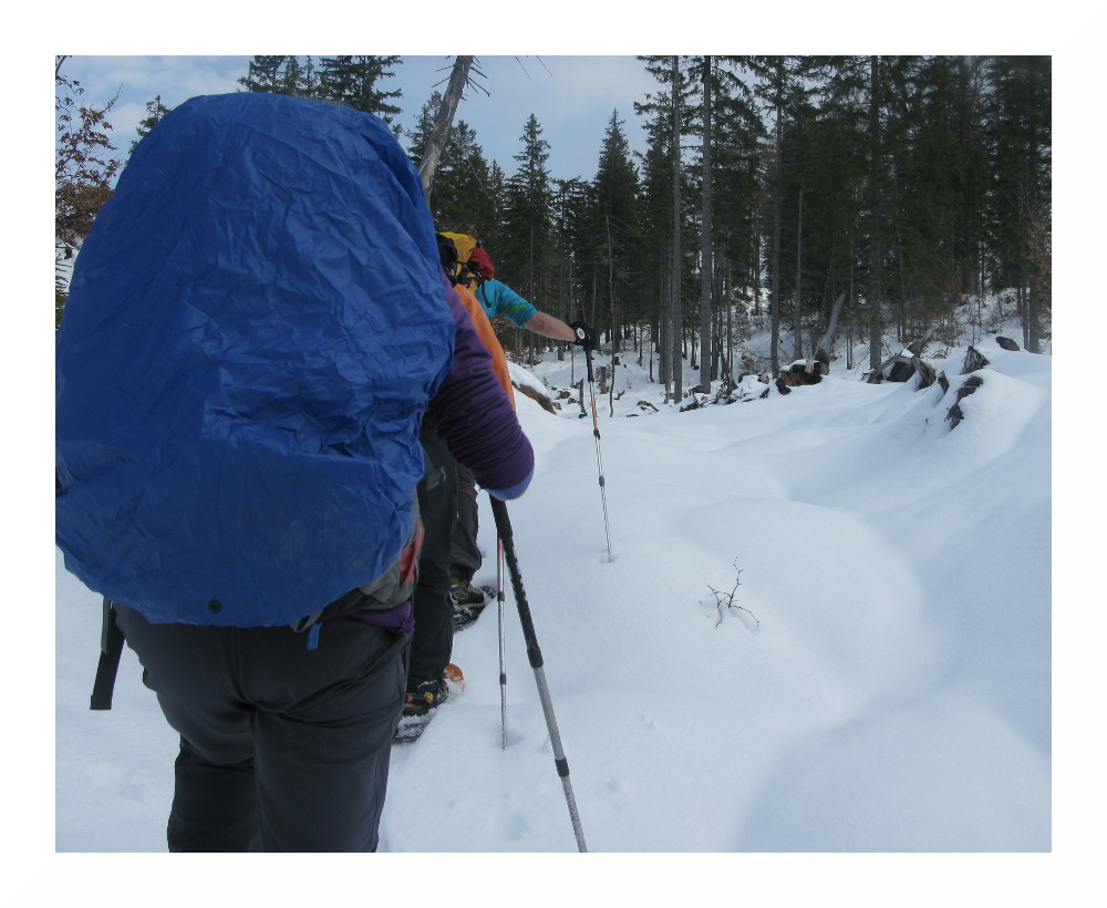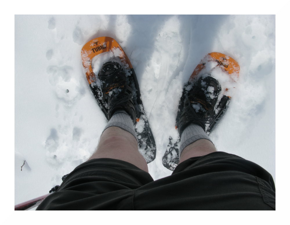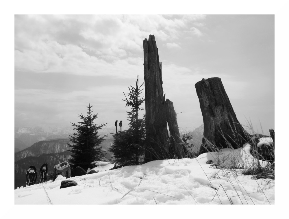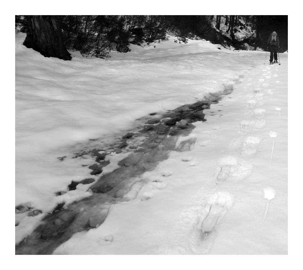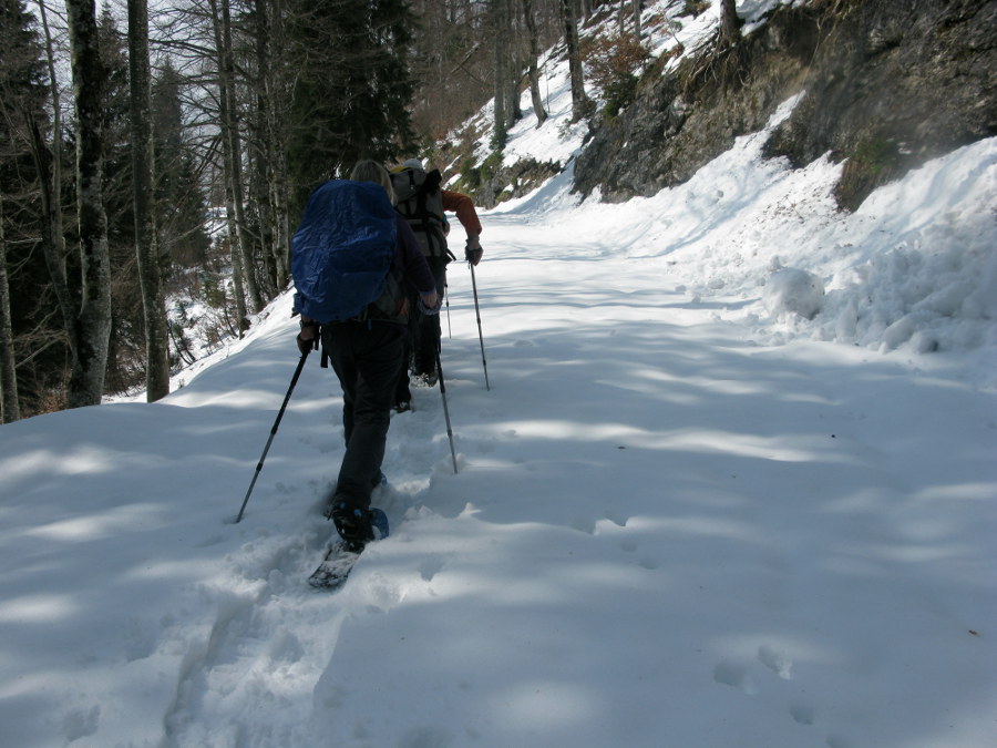 So früh wie schon seit längerem nicht mehr können wir die Schneeschuhe anlegen, nach einem knappen Kilometer und auf rund 1000 m Seehöhe.