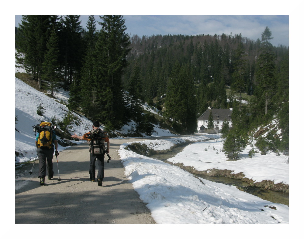 Man beachte die merkliche Dezimierung der Schneedecke auf dem Weg, ...