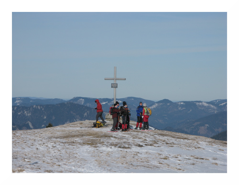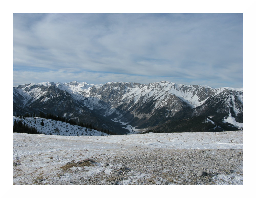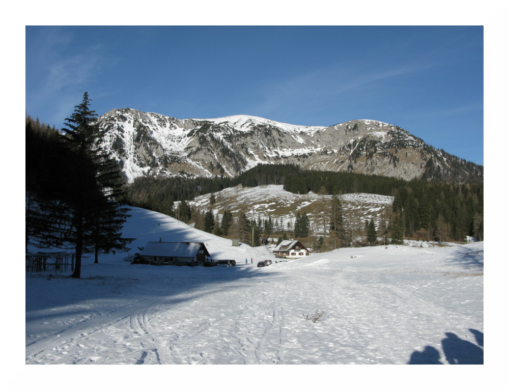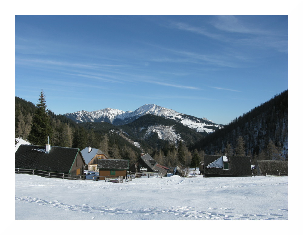 Nach einem kurzen Steilstück mit zeitweise nur wenig Schnee, das Gift für die Metallzacken an den Schneeschuhen war (wenn man sich die Schneeschuhe ruinieren möchte, dann im Winter 13/14), folgt die weitläufige Göriacher Alm mit wunderbarem Ausblick zur Veitsch mit Kl. und Gr. Wildkamm links, im Vordergrund Schottenkogel (1525m).