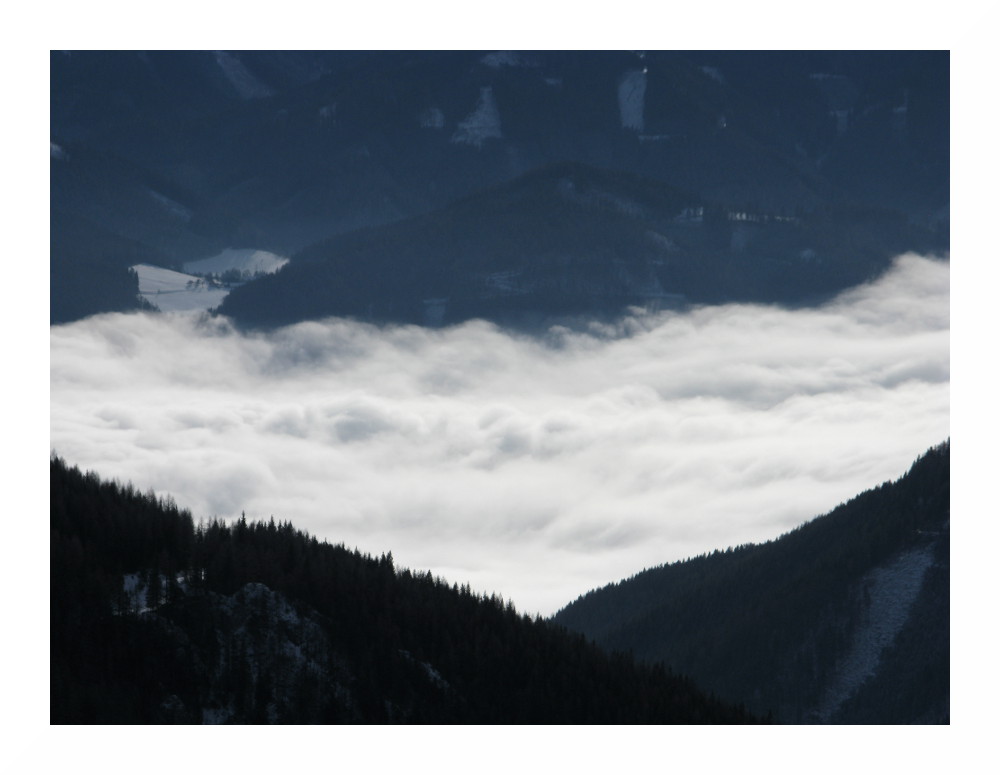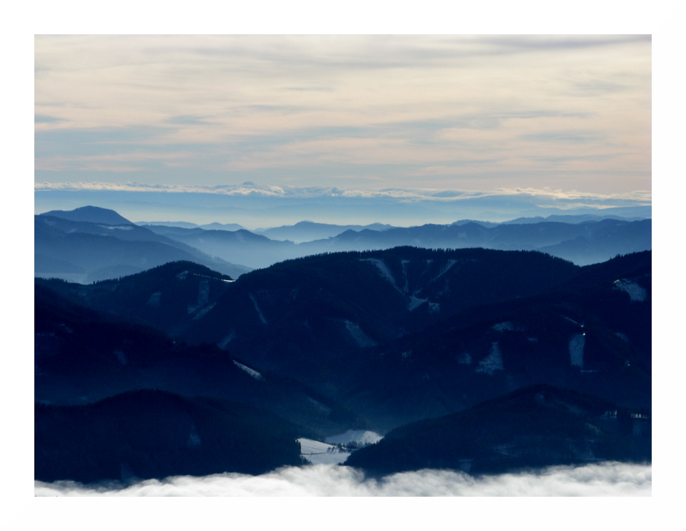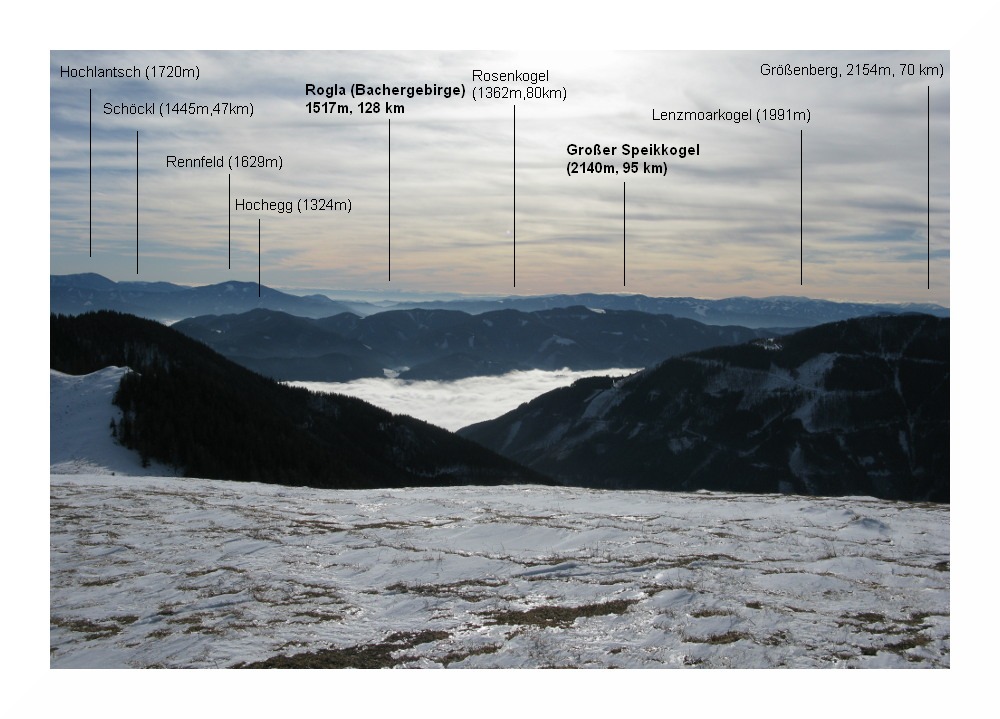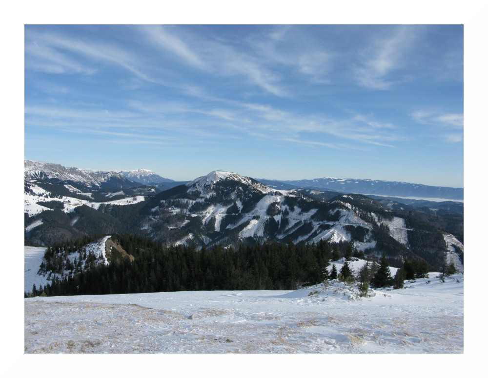 Im Vordergrund Roßkogel (1522m) und Rauschkogel (1720m), im Hintergrund links Veitsch-Ausläufer und Schneealpe, rechts Nebel im Mürztal und Stuhleck (1782m) sowie der langgestreckte Höhenzug der Fischbacher Alpen, rechts am Rauschkogel vorbei erkennt man noch den Sonnwendstein (1523m) am Semmering.