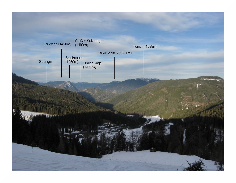Ganz links Terzer, Großer und Kleiner Göller, praktisch schneesicher, wenn sonst herum nichts liegt.