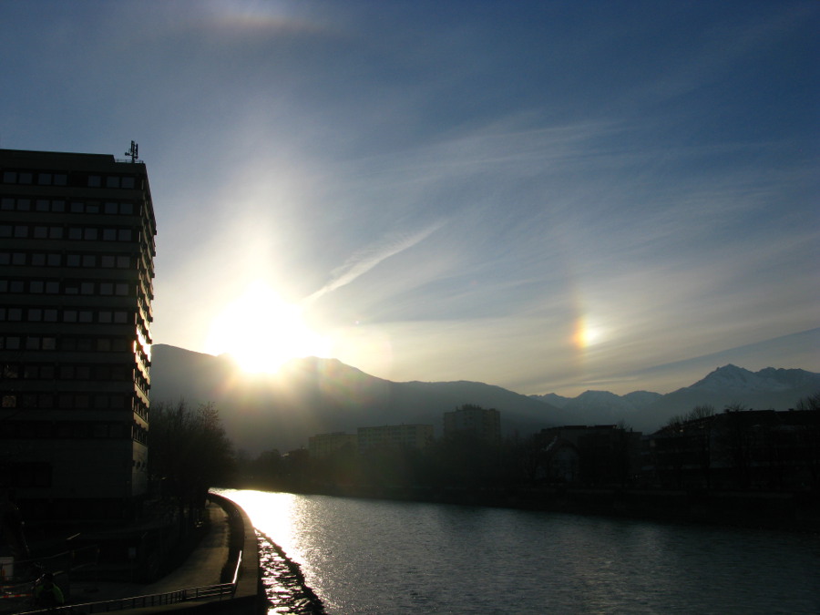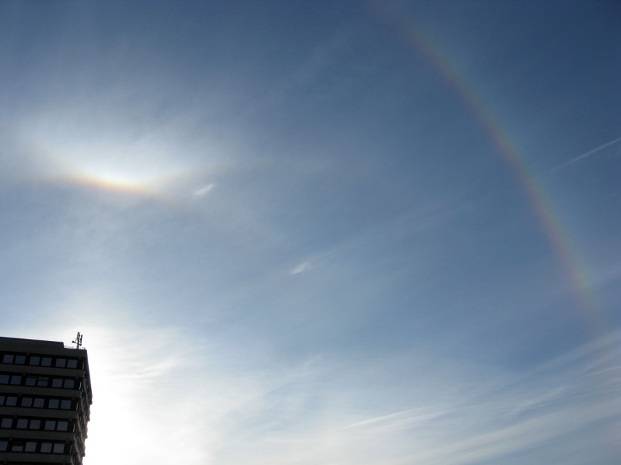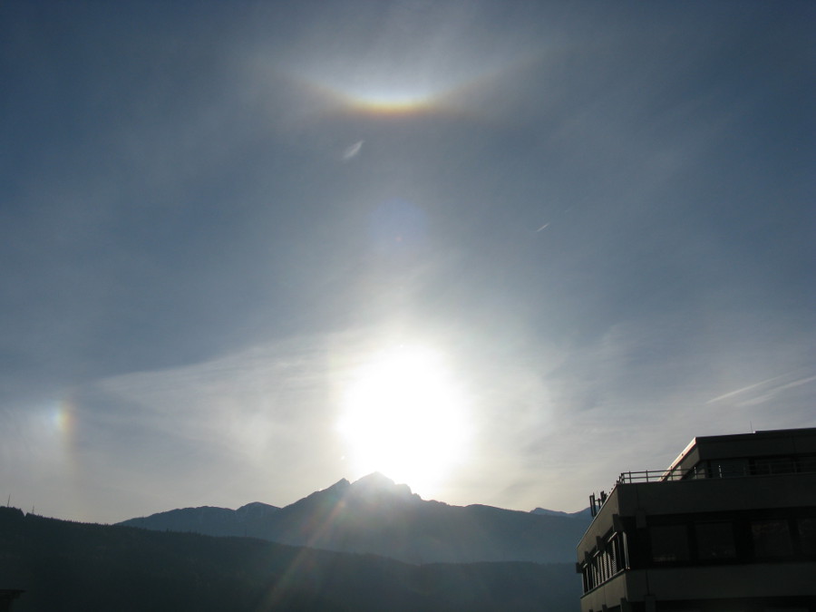 Bild 2: Extrem selten für die Tageszeit und Seehöhe: 22° Haloring mit Nebensonne, Oberer Berührungsbogen, Parrybogen
