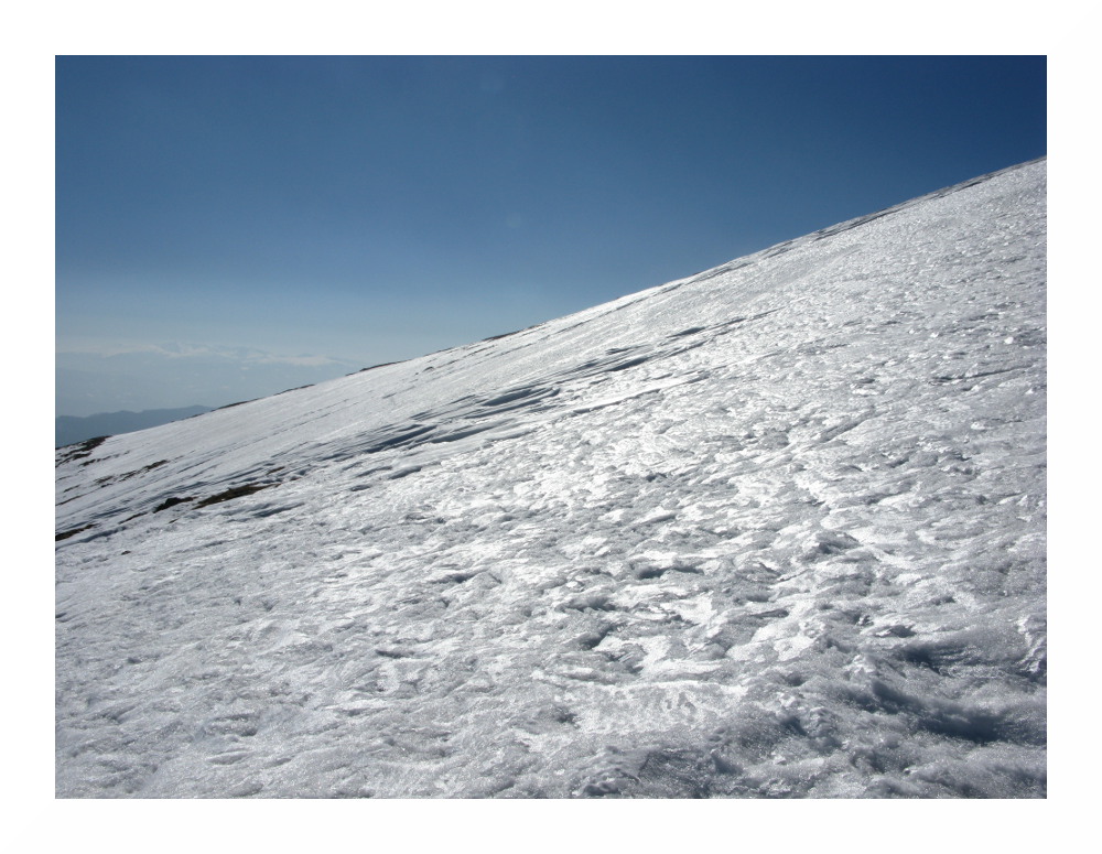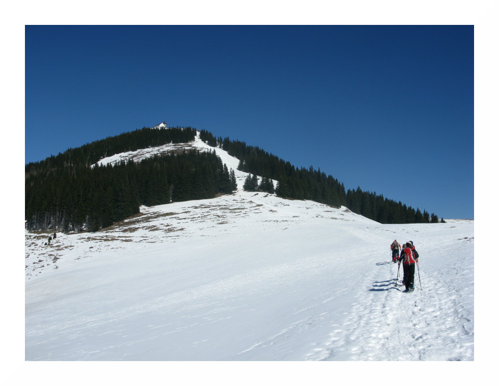 Wir gehen daher nicht weiter direkt am Kamm, sondern weichen nach links aus (markierter Weg). Kurz unterhalb der Kirche zieht der Weg sehr steil hinauf. Hier mit Schneeschuhen problemlos. Eisigere Bedingungen hätten wegen der Steilheit mitunter Steigeisen erfordert.
