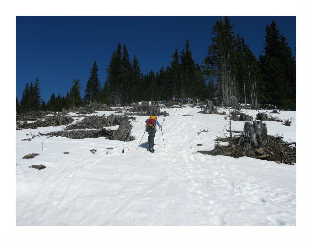 Für den weiteren Abstieg halten wir auf eine in der Kompass-Karte eingezeichnete Quelle zu, wo der Weg in einem geschlägertem Gebiet mit einigen Latschen und Jungwald unterbrochen ist. Dank genügend Schnee ist das Weiterkommen jedoch kein Problem, und wir gelangen auf die gewünschte Fortsetzung, die uns einiges an Umweg über die Forststraße erspart.