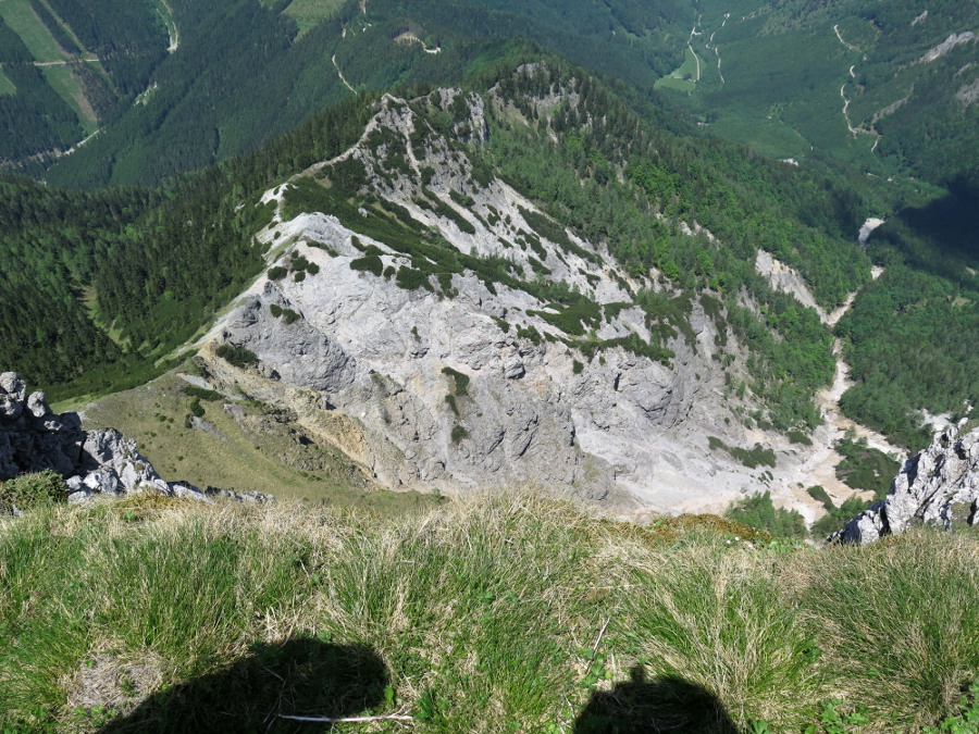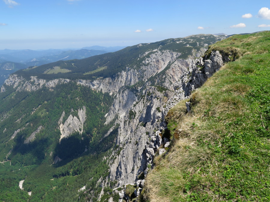 Hinter der Wiese bricht das Gelände fast senkrecht ab zum Rehboden (gut 1000 hm). Unten das Reißtal, rechts die Scheibwaldmauer.