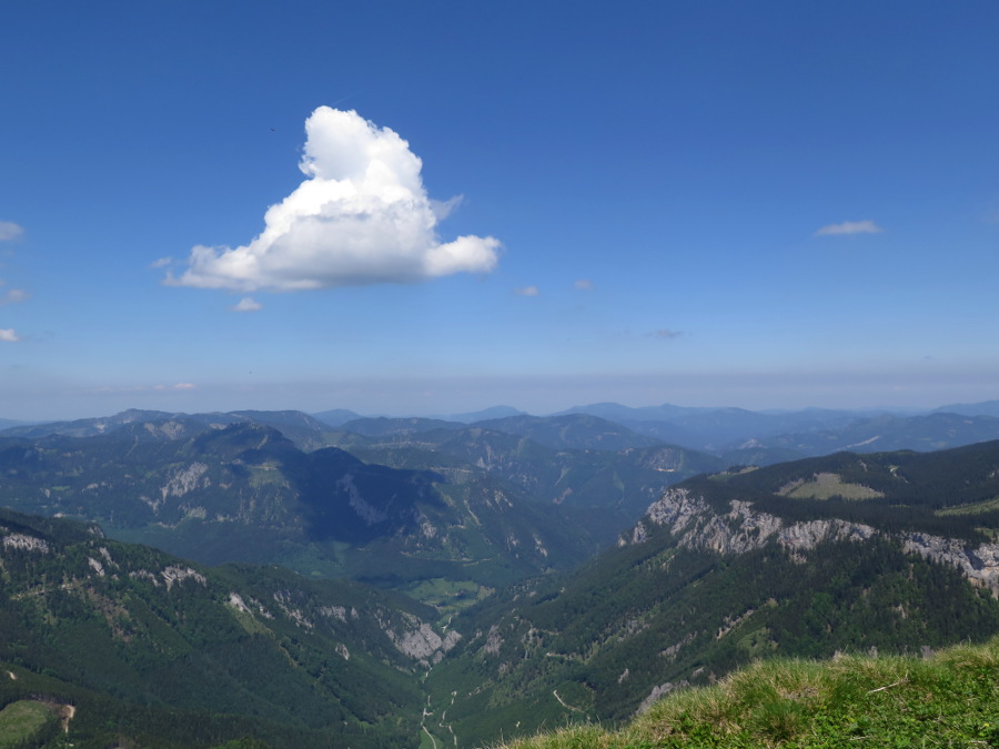 Im Hintergrund praktisch unter der Quellwolke der Türnitzer Höger (1372m, 26 km), rechts die Traisener Hinteralm (1311m), weiter rechts folgen Eeisalpe und Hochstaff.Dank der von Norden einsickernden trockenen Luft ist die Fernsicht recht gut, erst über dem Donautal halten sich schmutzige Dunstbänke.