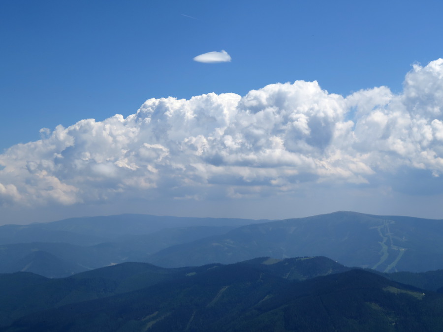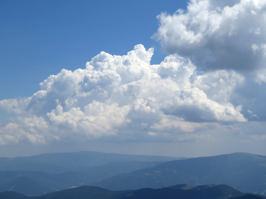 Der Cumulus congestus steht genau über dem Hochwechsel (1743m), eine nahezu sichere Bank, was Wärmegewitter anbelangt. Die kegelförmig zulaufenden Flanken und mäßig steiles, bewaldetes, immerfeuchtes Waldgelände sind der Prototyp für prädestinierte Gewitterentstehungsorte.