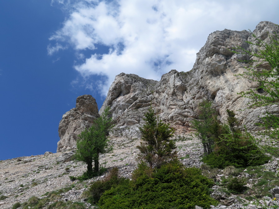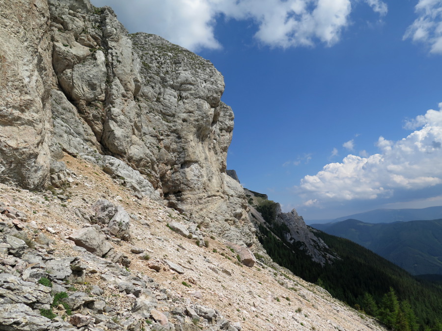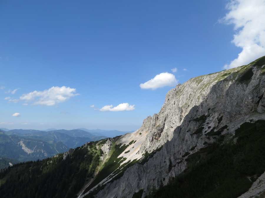 Rechts durch die Abbrüche führen Wildfährte und Bärenlochsteig, im Hintergrund entdecken gute Augen auch das Habsburghaus (1786m) und hinten rechts den Schneeberg.