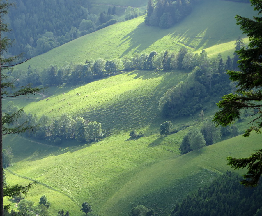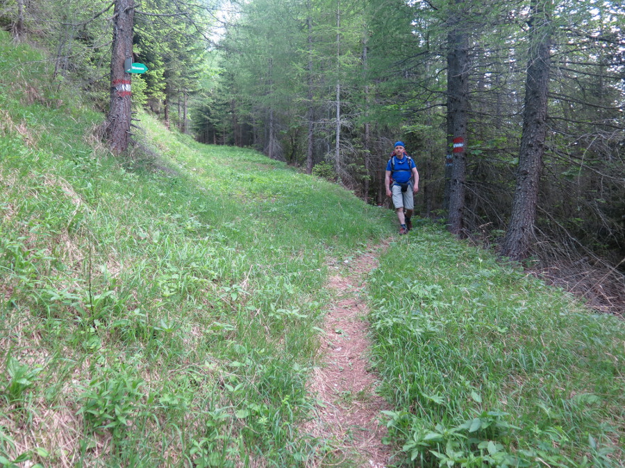 Auf rund 1480 m treffen wir bei der Karreralm wieder auf angenehmen Wiesenboden. Für eine Einkehr im Gasthof Moassa (1172m) ist es heute zu spät, wir schneiden daher die Forstwege ab und wenden uns nach rechts ...