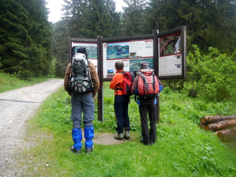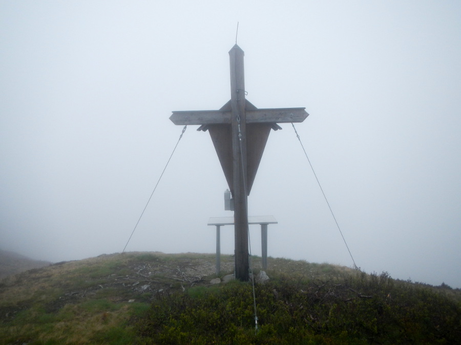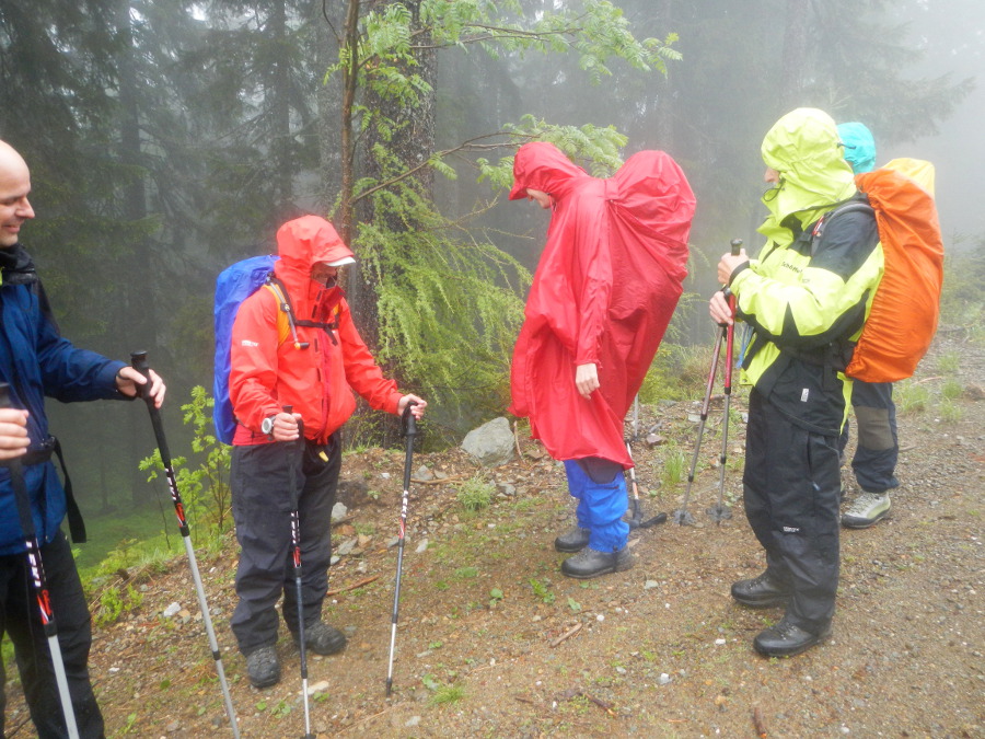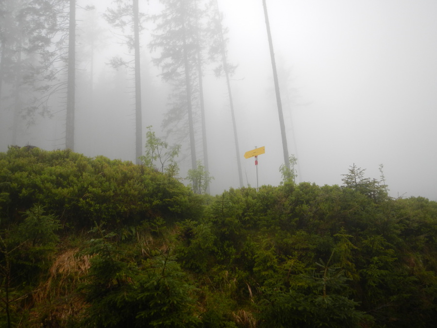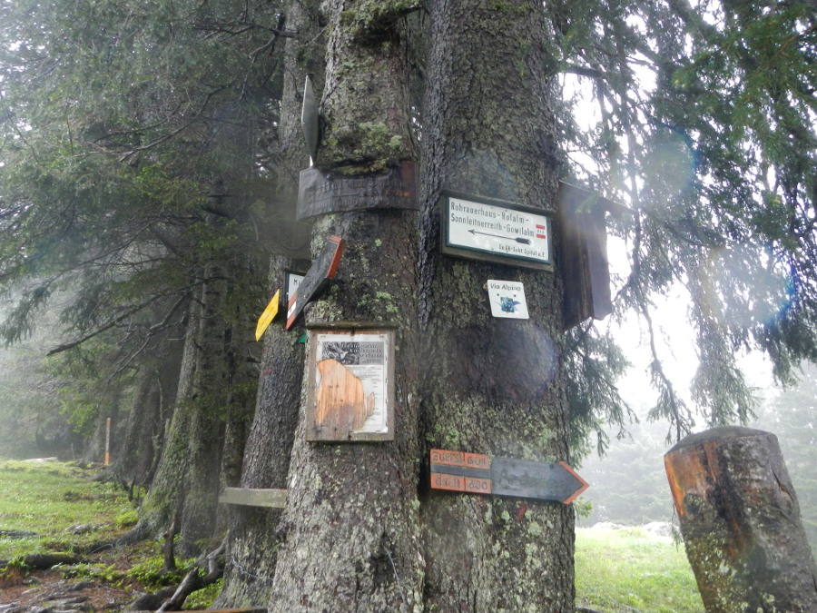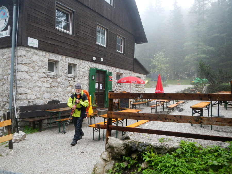 Bild 3: Bei nebelartiger Bewölkung wird der Nieselregen stärker. Also wieder Regenhose an beim Rohrauerhaus (1308m).