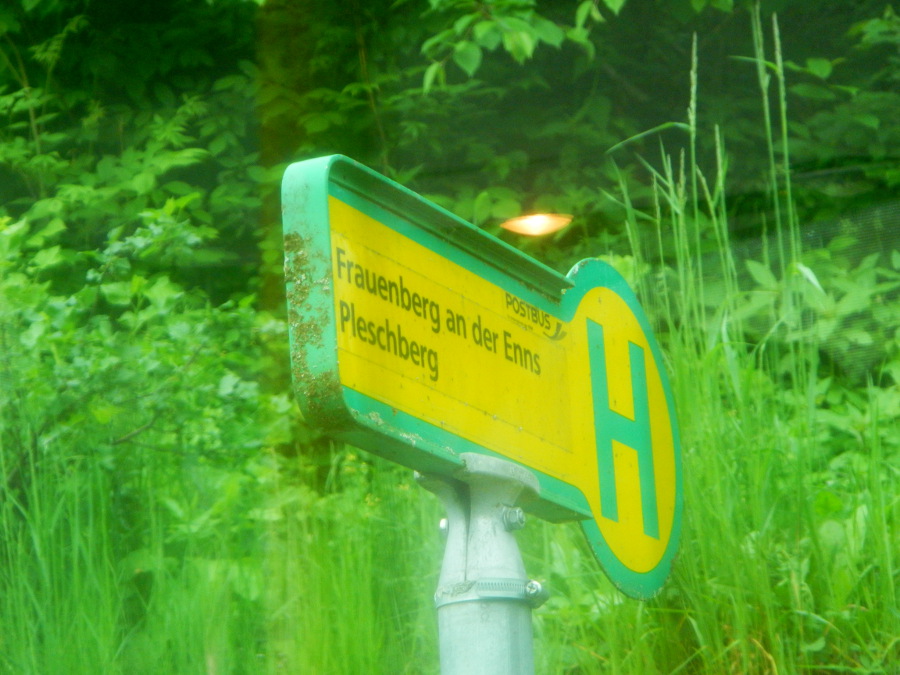 Mit der Gewissheit, auf ein Taxi ausweichen zu müssen (der nächste Zug wäre erst 2 Std. später gefahren), lassen wir an Tempo nach. Und gelangen schließlich auf die Landstraße zwischen Frauenberg und Ardning. Etwas rechts der Kreuzung erblicken wir eine Bushaltestelle. Reini schaut gerade auf dem Fahrplan nach, wann der nächste Bus geht, als ich bereits ein unzweideutiges Motorgeräusch wahrnehme: Und tatsächlich biegt nicht einmal eine Minute, nachdem wir die Bushaltestelle erreicht haben, der Linienbus Richtung Liezen um die Ecke.