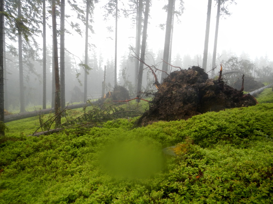 Zahlreiche Fichten hat es hier mitsamt dem Wurzelteller umgerissen, auch einzelne Brüche sind erkennbar. Der Boden ist recht feucht, dennoch würde ich F1-T2-T3 als Schadensintensität auf der Fujita-Torro-Skala annehmen (120-180 km/h).
