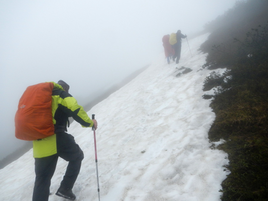 Die unteren Schneefelder können wir noch umgehen, weiter oben müssen wir dann drüber. Sie sind recht hart, das Gelände zum Glück nicht extrem steil. Dennoch heißt es aufpassen.