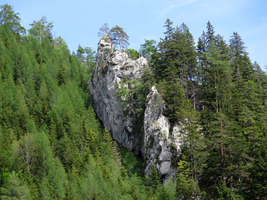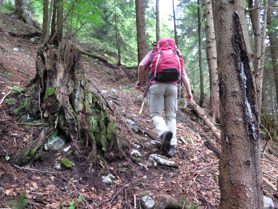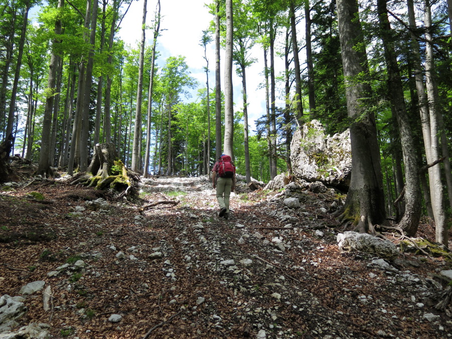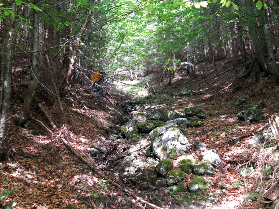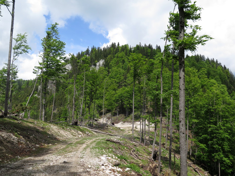 Das erste Stück folgt der Forststraße bis zur Gabelung, dann links in den Graben hinein. Dann folgt der nicht mehr auffindbare Jagdsteig einem gut ausgeprägten Kamm, bis man, wieder mit sichtbaren Steigspuren, auf eine Forststraße trifft. Von dort kämpften wir uns quer durch den Wald, rechts an einer Felsstufe vorbei, zurück auf den teils wieder sichtbaren Jagdsteig.
