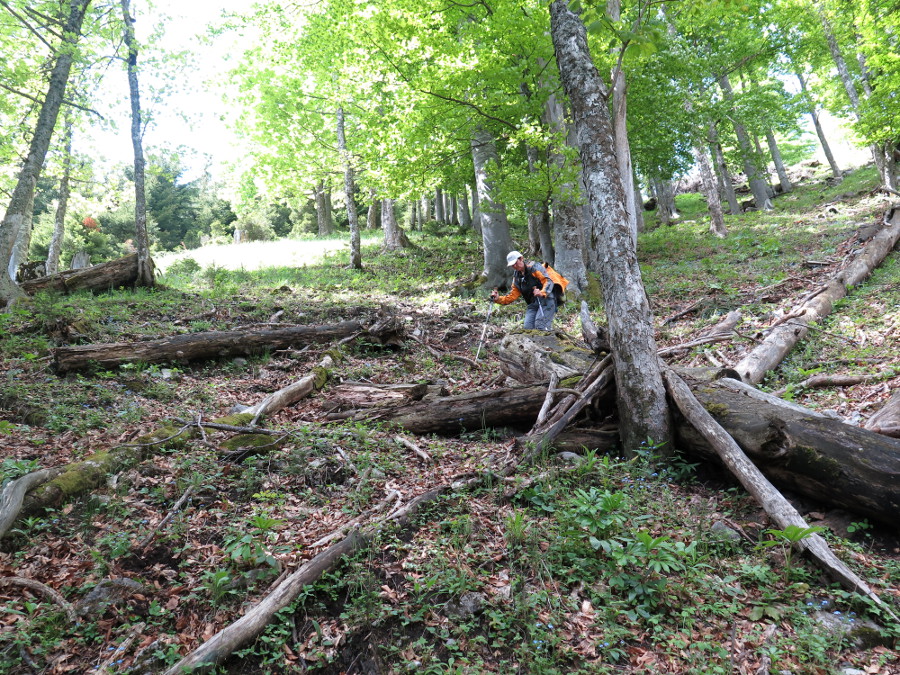 Nach einem kurzen Verhauer steigen wir wieder rund 40 hm zu einer Jagdhütte hinauf, dort zweigt theoretisch ein Jagdsteig nach Osten ab (hinter dem Plumpsklo). Praktisch war er ziemlich zugewachsen. Steigspuren waren schwer von Wildpfaden zu unterscheiden. Unsere Überlegung war optimistisch: Dort, wo der Steig einmal verlief, muss das Gelände gangbar gewesen sein.
