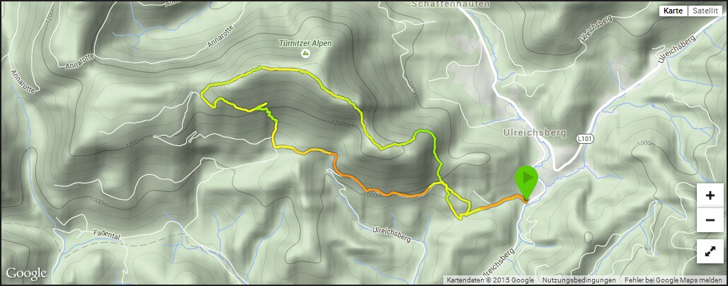 - Wegführung: Ulreichsberg, Abzw. (870m, 10.30) - verfallene Jagdsteige - Kleiner Sulzberg (1252m, 11.55) - Großer Sulzberg (1400m, 12.55) - Jagdhütte (1290m, 14.00) - verfallene Jagdsteige - Quelle (15.00)- Ausgangsort (16.00)
