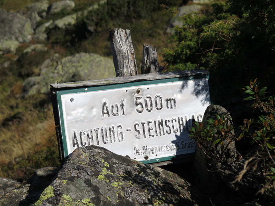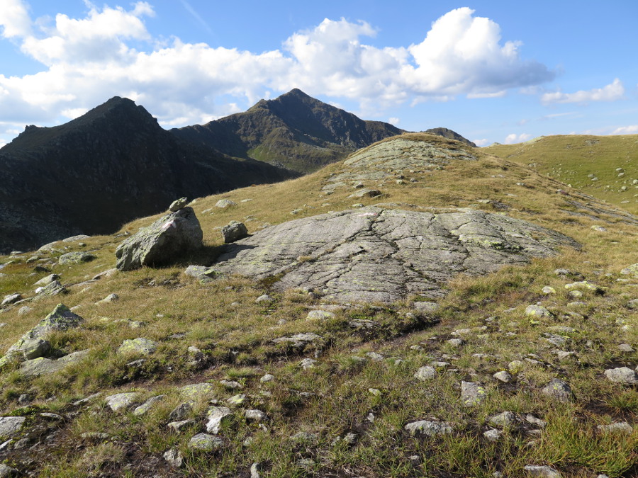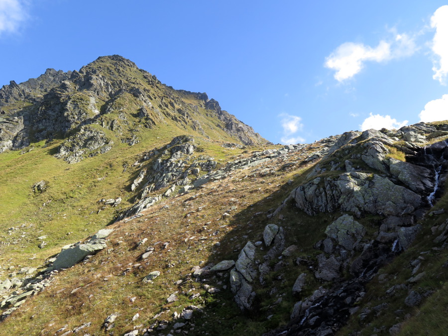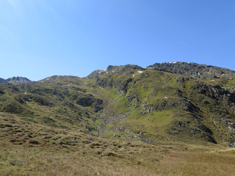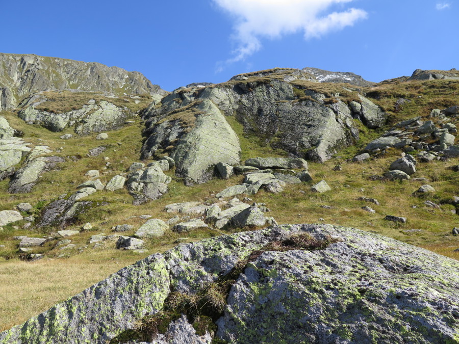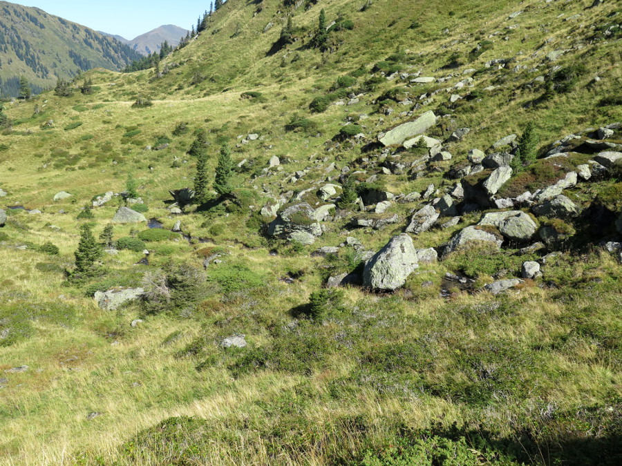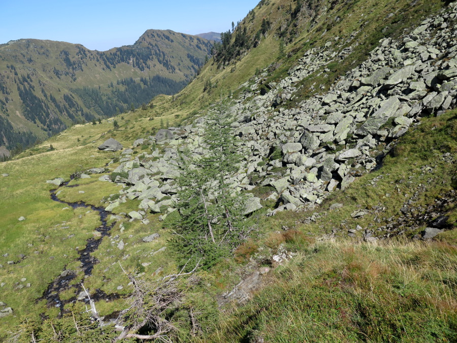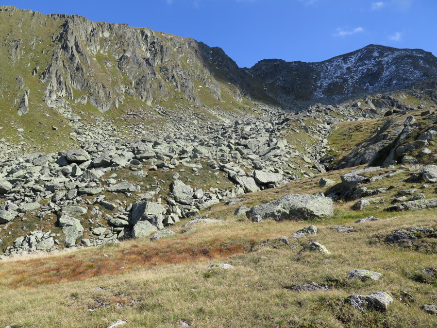 Am Rande dieser Felssturzrinne kann man zu zwei kleinen Seen steil hinaufstechen, dann geht's gemütlich zum Gipfel (vom Standort rund 250 hm).