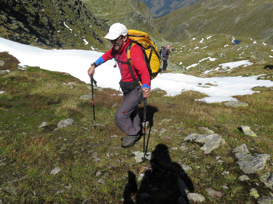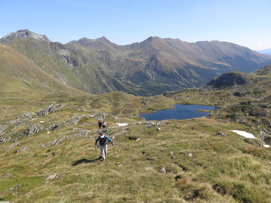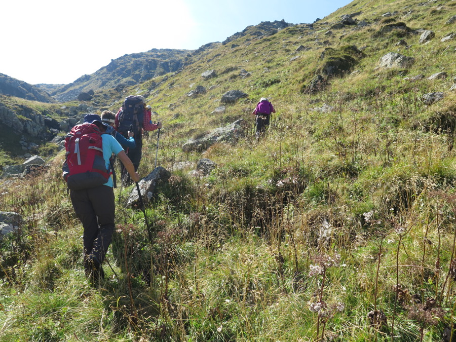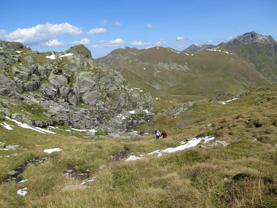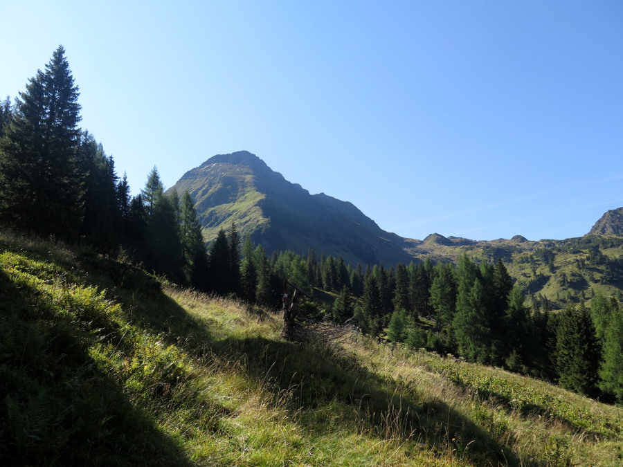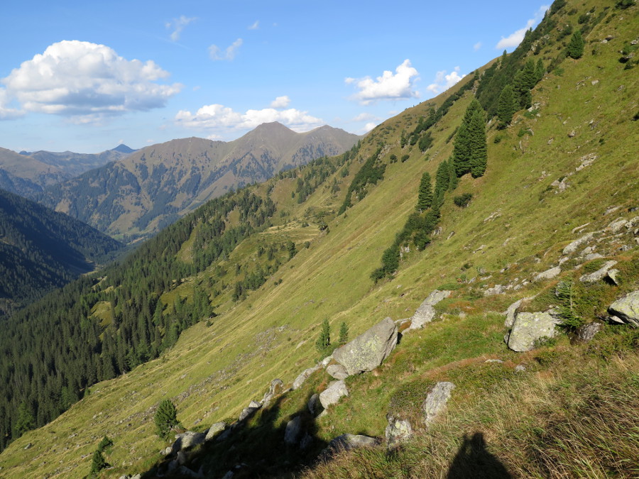 Wir entschließen uns, den Alker auszulassen (mit Gegensteigung hätten sich gut 1500 hm summiert), und steigen am linken Rücken Richtung Talkenschrein auf. Dort befinden sich auch Wegspuren.