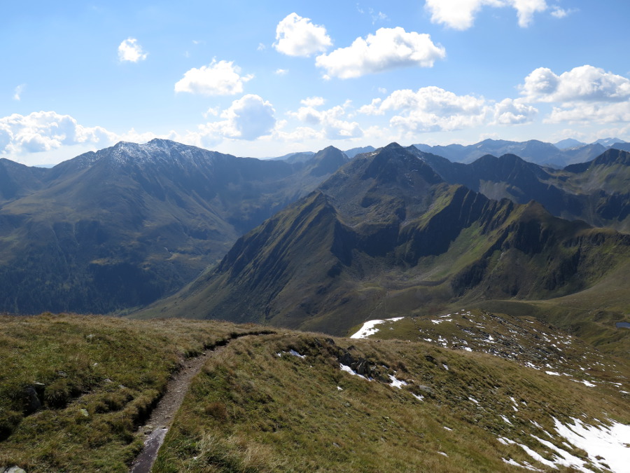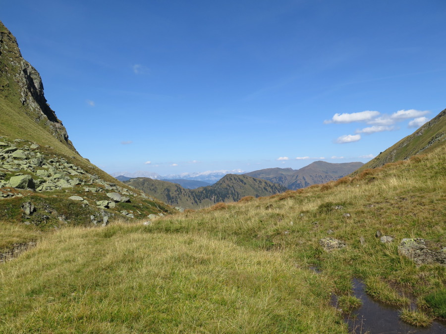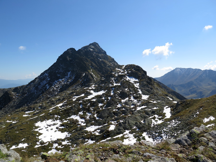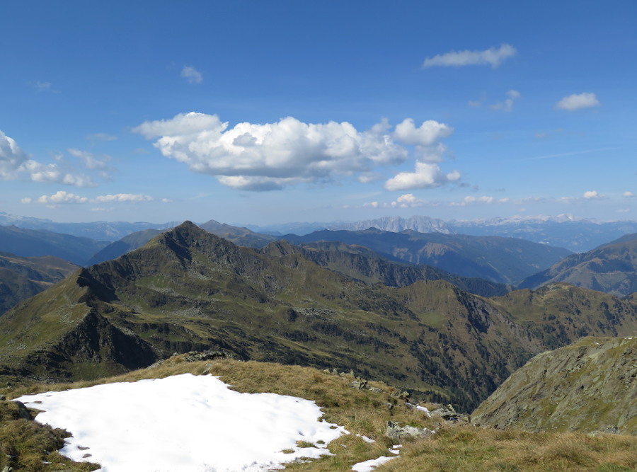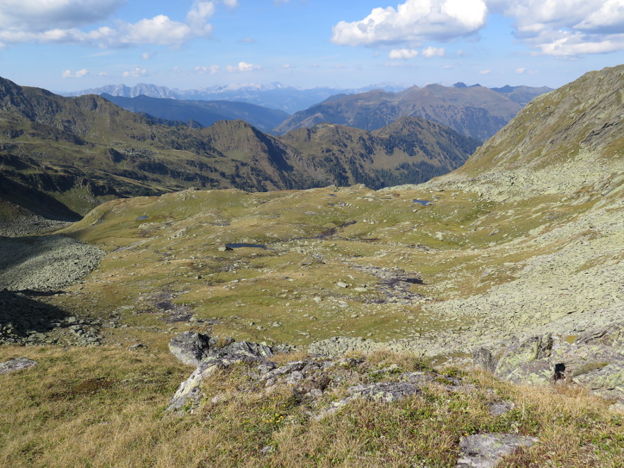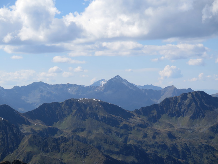 Zwischen Straßeck (2390m) und Rettlkirchspitze (2475m) über die Funklscharte hinweg lugen die Zacken der Julischen Alpen in 100 km Entfernung hervor.