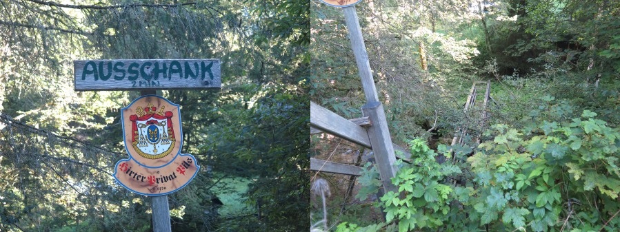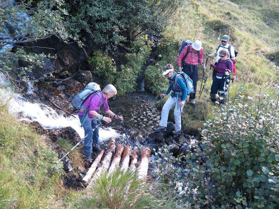 Keine intelligente Lösung einer Behelfsbrücke. Denn die Holzbohlen sind urglatt bei Nässe. Besser auf die Steine im Bachbett stellen.