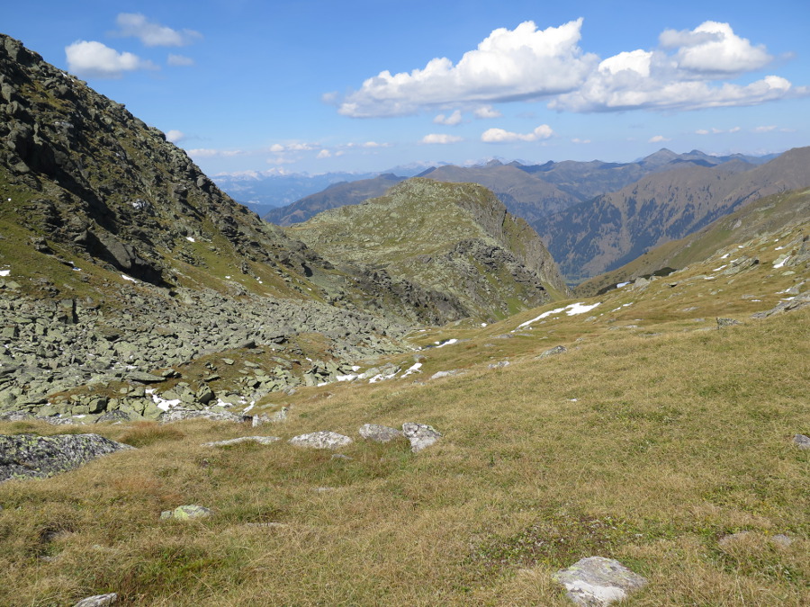Von unten zieht die Rinne rauf, die zu den kleinen Seen am Plateau des Alker leitet. Vom Standort hinüber queren dürfte weitaus mühsamer sein, zu viel große Blöcke im Weg.
