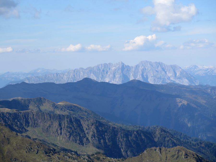 Auffällig sind Feuertalberg (2376m), Großer Hochkasten (2389m), Spitzmauer (2446m) und Großer Priel (2515m), weiter rechts spitz der Almkogel (2116m), weiter rechts Teufelsmauer (2185m)